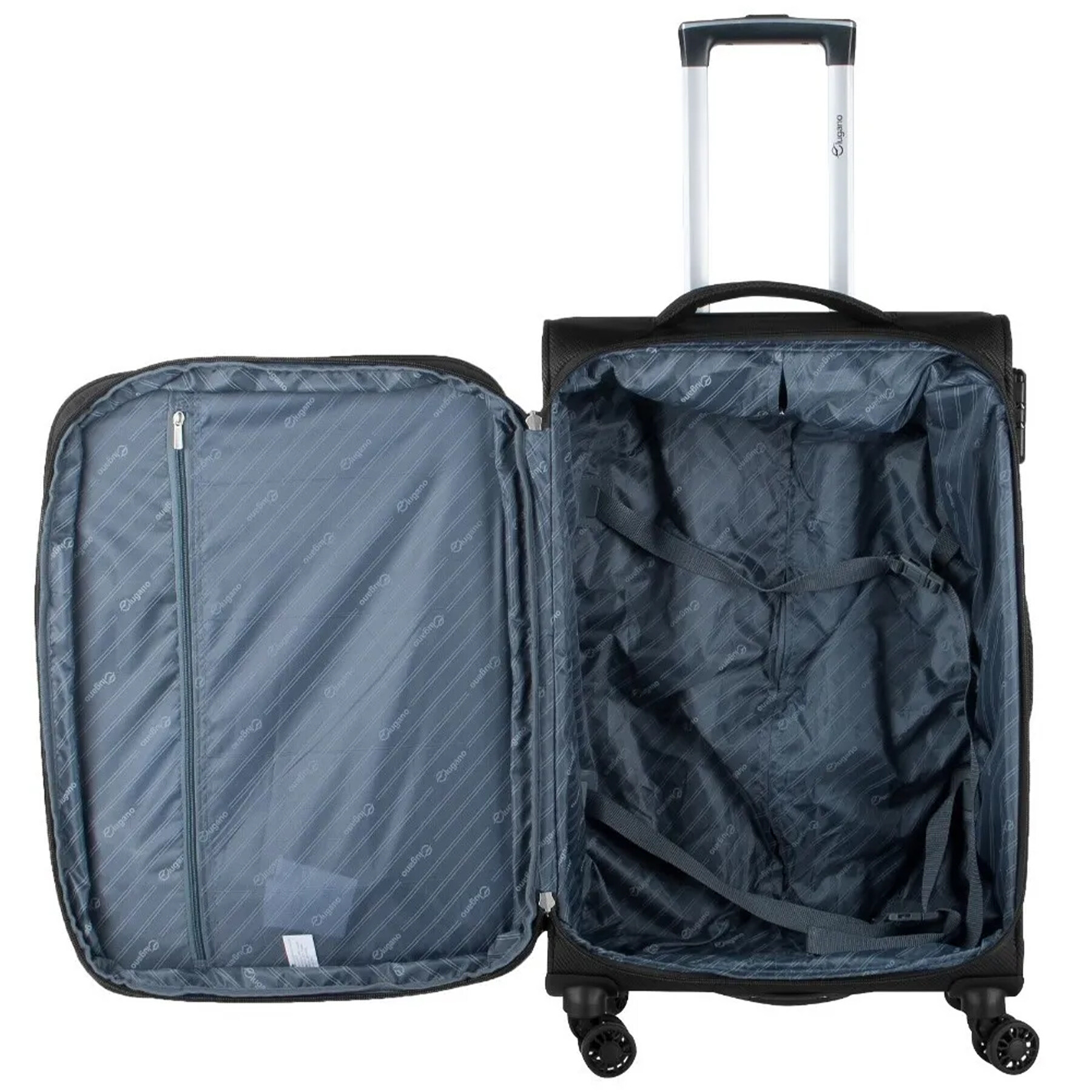 Чемодан Lugano Duna (L) Black обладает следующими особенностями: расширительный клапан, кодовый замок, внешние карманы, четыре полнооборотных колеса и широкая мягкая ручка в верхней и боковой частях чемодана, что делает его достаточно функциональным и удобным в использовании. Расширительный клапан, при необходимости, позволяет увеличить объем чемодана до 116 литров и удобно упаковать вещи, чтобы всегда было достаточно места. Пластиковый каркас задней стенки и стальной профиль по периметру позволяют чемодану держать форму даже при неполной загрузке. Телескопическая ручка фиксируется в двух положениях.