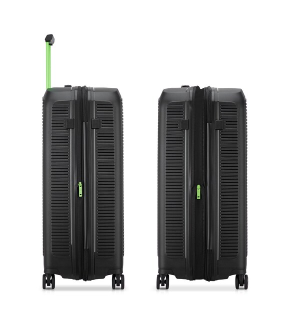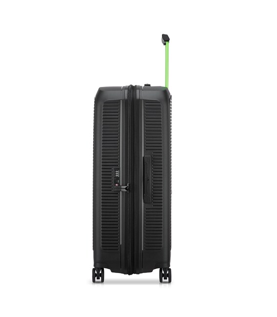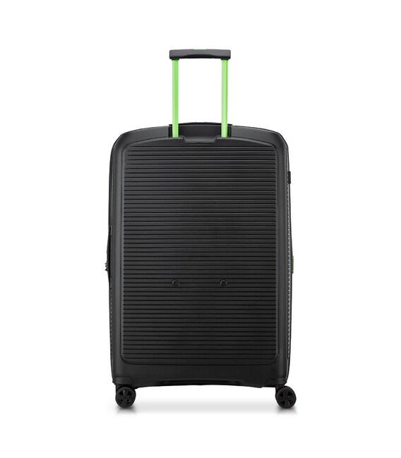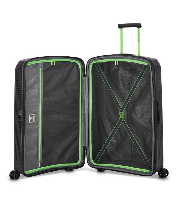 Чемодан изготовлен из полипропилена на 100% переработанного материала, который предлагает: максимальную ударопрочность, чрезвычайную прочность, оптимальную лёгкость, термостойкость. Оснащена 4 спаренными и маневренными колесами. Для удобства перемещения предусмотрена гибкая, подъемная пластиковая ручка на верхней и боковой панелях, а также телескопическая ручка. Безопасность и сохранность багажа обеспечивает встроенный кодовый замок с системой TSA. Изделие состоит из двух больших отделений, оснащенных разделителями и эластичными прижимными ремнями. Также имеет расширение для увеличения пространства для вещей.