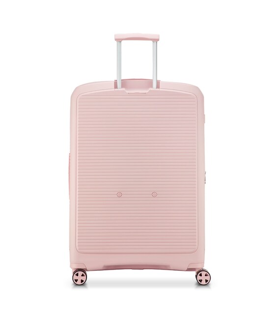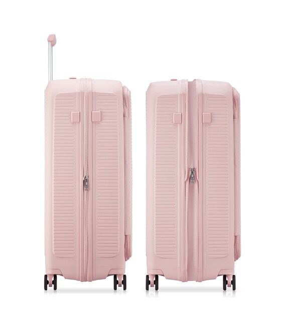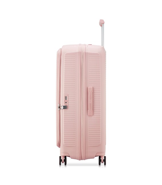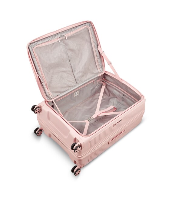 Чемодан изготовлен из полипропилена на 100% переработанного материала, который предлагает: максимальную ударопрочность, чрезвычайную прочность, оптимальную лёгкость, термостойкость. Оснащена 4 спаренными и маневренными колесами. Для удобства перемещения предусмотрена гибкая, подъемная пластиковая ручка на верхней и боковой панелях, а также телескопическая ручка. Безопасность и сохранность багажа обеспечивает встроенный кодовый замок с системой TSA. Среди наиболее ценных особенностей – инновационная система FLAT TOP: открывающаяся крышка на 90° вместо центрального отверстия. Дизайн разработан для уменьшения объема и облегчения доступа к содержимому.