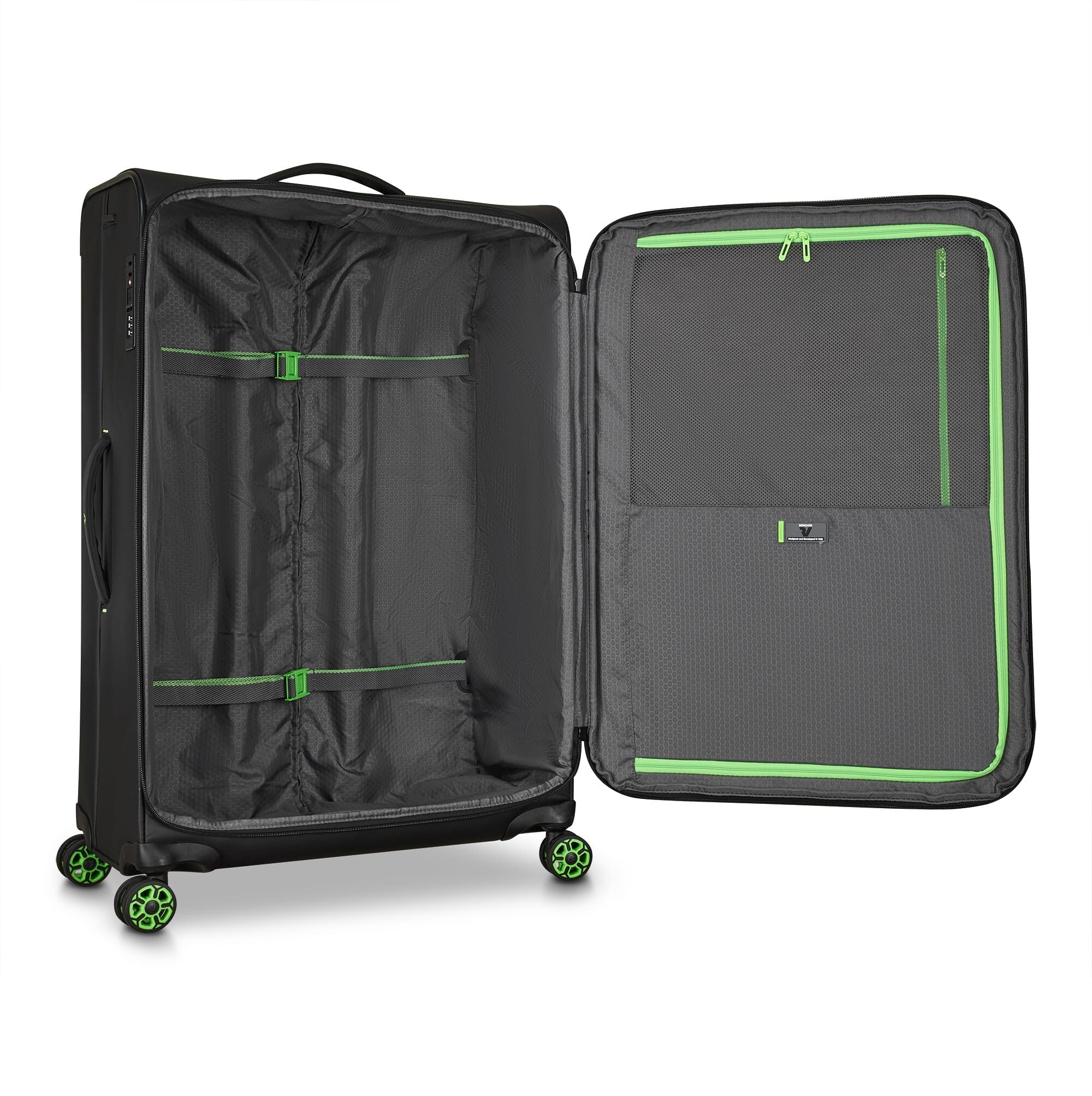 Изделия коллекции изготовлены из волнистого полиэстера 900D с PU-покоем, которое защищает от дождя, брызг, влаги и быстро сохнет. Обработанная поверхность гарантирует высокую стойкость к истиранию и износу, а также превосходную устойчивость к сцеплению и разрывам, даже при интенсивном использовании. Каждая тележка оснащена водонепроницаемой молнией и кодовым замком TSA-системой, что обеспечивает максимальную безопасность ваших личных вещей, содержащихся внутри багажа. Двойные колеса, вращающиеся на 360°, нижняя часть чемодана усилена текстурированным стойким к царапинам резиновым материалом.