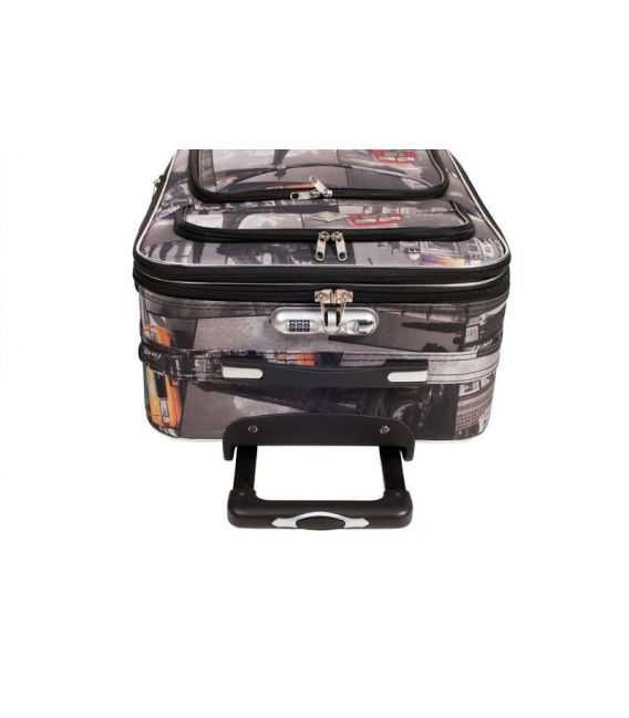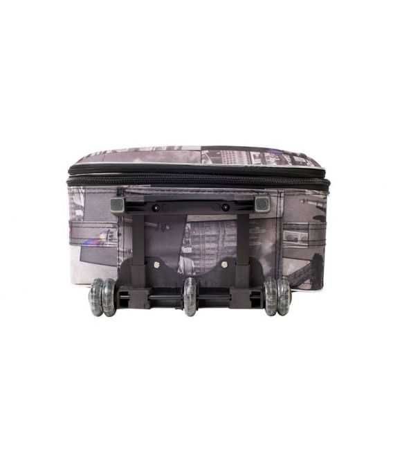 Чемодан изготовлен из прочного материала Cordura 800D устойчивого к повреждениям промокания и истирания. Корпус оснащен 5 независимыми друг от друга колесами, что исключает износ чемодана. Имеет выдвижную ручку, две удобные ручки для рук, позволяющие удобно переносить чемодан, кодовый замок.