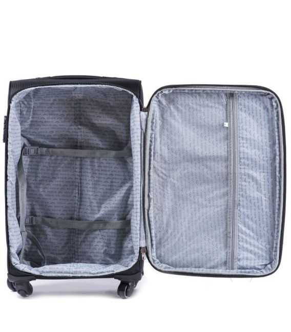 Дорожный чемодан оснащен двумя большими колесами из полиуретана на подшипниках, часть которых встроена в корпус изделия что делает их более прочными. Благодаря технологии "soft ride" колеса не шумят при транспортировке.