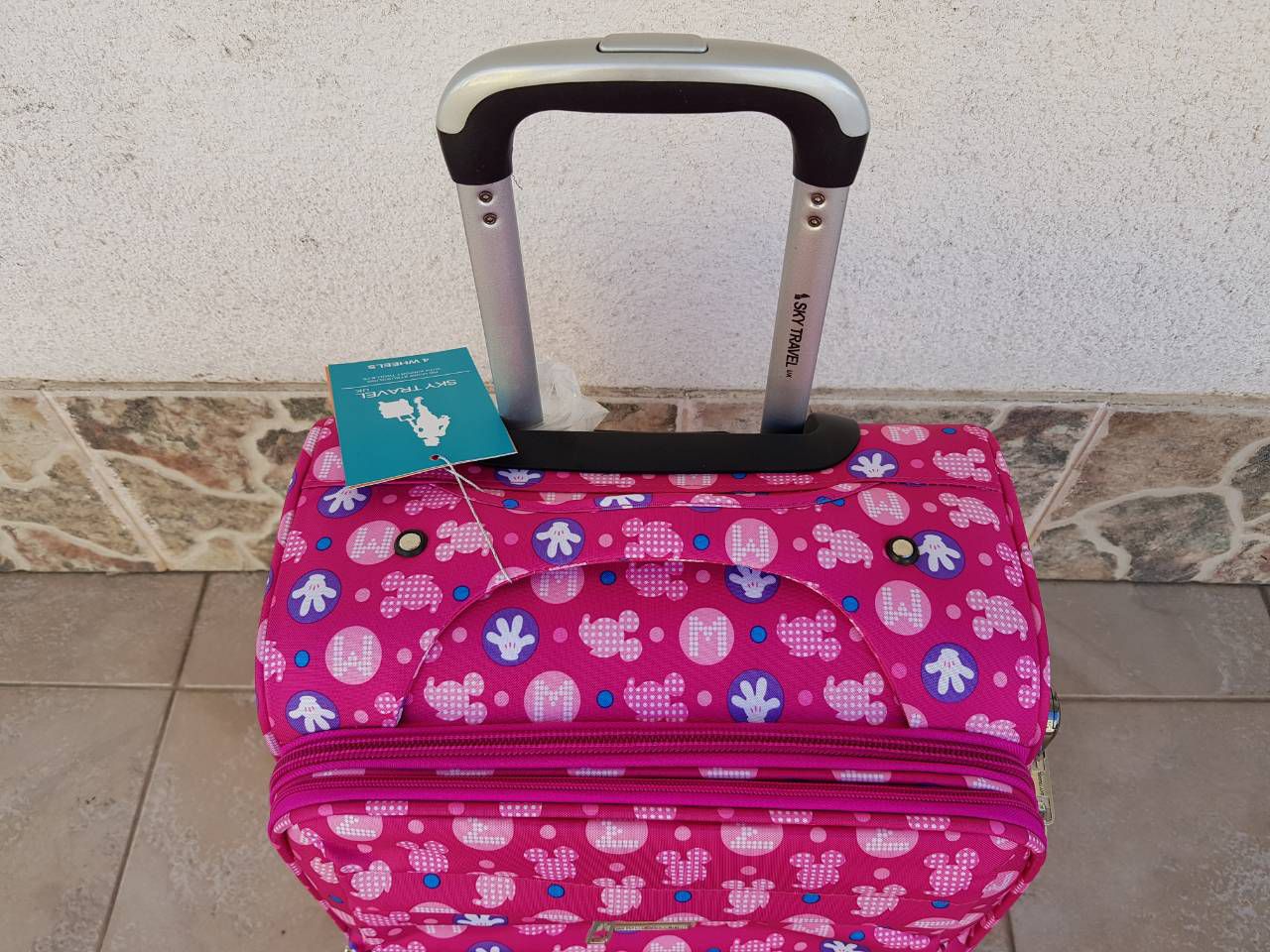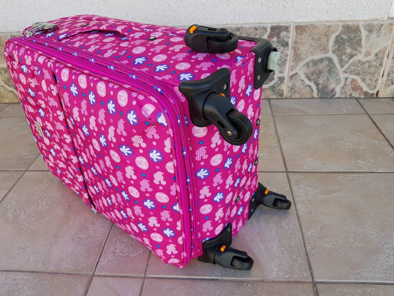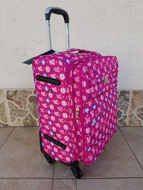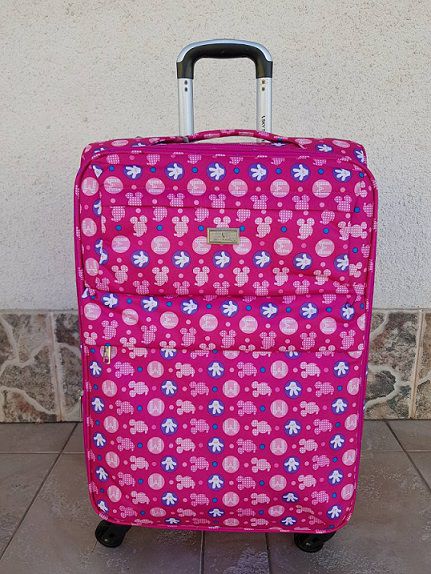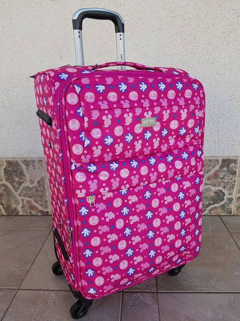 Прочный и удобный чемодан с красивой расцветкой в розовых тонах с интересным принтом микки мауса . Материал — полиэстер. Устойчивый к световому и тепловому воздействию. Четыре съемных колеса вращающиеся на 360 градусов, придают маневренности и позволяют катить чемодан рядом с собой,и распределяют нагрузку равномерно. Имеет встроенный кодовый замок с функцией многократной замены кода, который обеспечивает сохранность внутреннего багажа. Выдвижная телескопическая ручка, ручка сверху и ручка сбоку чемодана. Возможность увеличения объема чемодана на 20%. Закрывается чемодан на молнию. Внутри одно отделение, в котором предусмотрены прижимные ремни для фиксации вещей. Внутри на крышке чемодана карман на молнии. Снаружи на передней стенке чемодана два кармана на молнии.