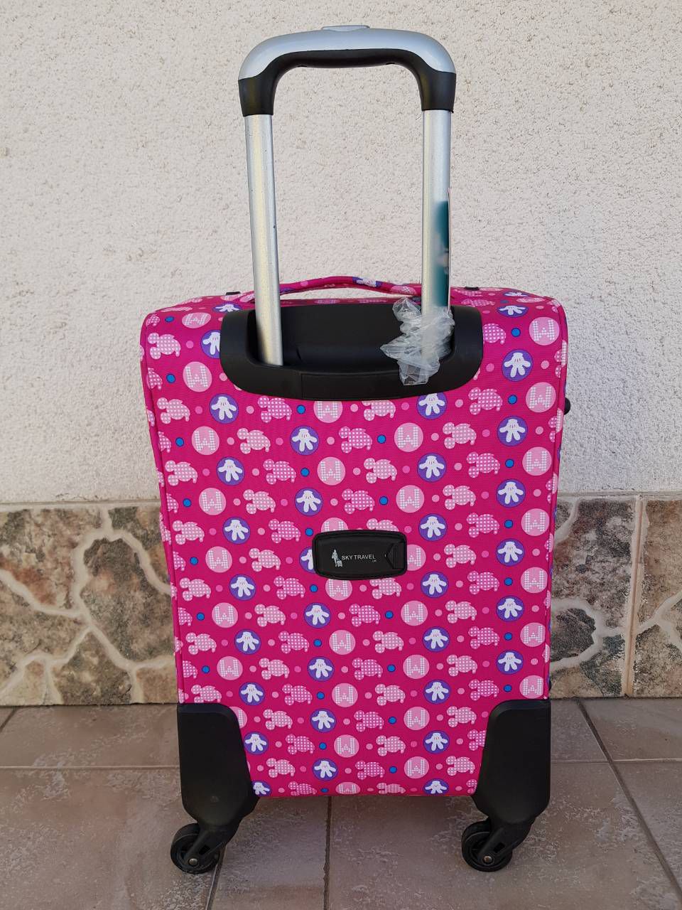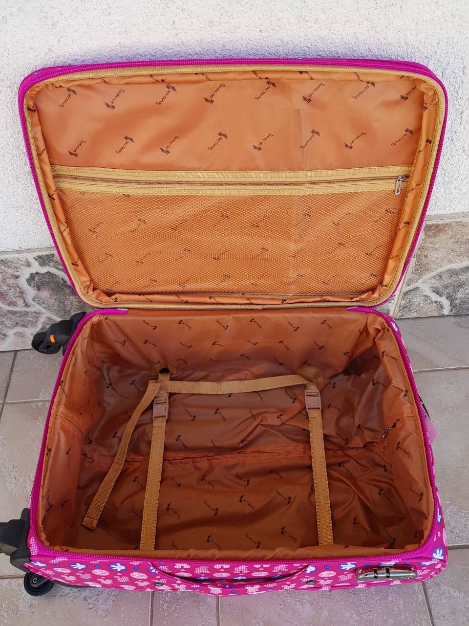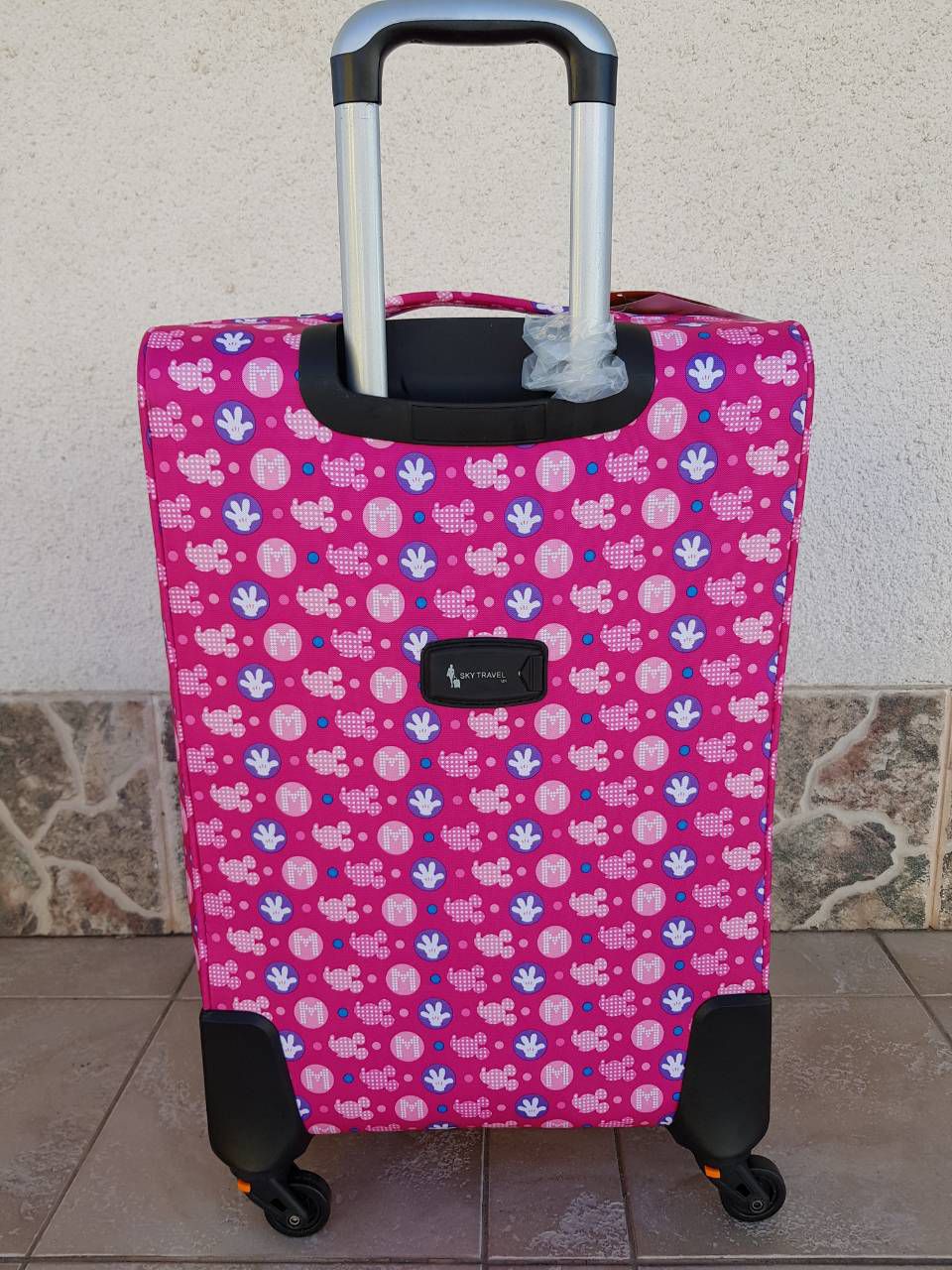 Прочный и удобный чемодан с красивой расцветкой в розовых тонах с интересным принтом микки мауса . Материал — полиэстер. Устойчивый к световому и тепловому воздействию. Четыре съемных колеса вращающиеся на 360 градусов, придают маневренности и позволяют катить чемодан рядом с собой,и распределяют нагрузку равномерно. Имеет встроенный кодовый замок с функцией многократной замены кода, который обеспечивает сохранность внутреннего багажа. Выдвижная телескопическая ручка, ручка сверху и ручка сбоку чемодана. Возможность увеличения объема чемодана на 20%. Закрывается чемодан на молнию. Внутри одно отделение, в котором предусмотрены прижимные ремни для фиксации вещей. Внутри на крышке чемодана карман на молнии. Снаружи на передней стенке чемодана два кармана на молнии.