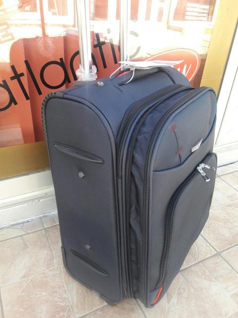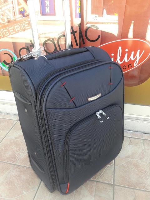 Сверху и сбоку чемодана расположены ручки для переноски его в вертикальном или горизонтальном положениях. Имеется также выдвижная телескопическая ручка на металлической основе с кнопкой для фиксации высоты.