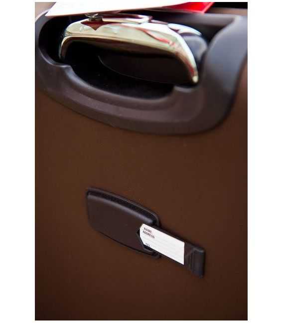 Внутри чемодана имеется 2 отделения, одно с прижимными ремнями, другое закрывается на молнию. А так же карман для мелочей на молнии. Сверху и сбоку чемодана расположены ручки для переноски его в вертикальном или горизонтальном положениях. Имеется также выдвижная телескопическая ручка на металлической основе с кнопкой для фиксации высоты. При необходимости есть возможность увеличения чемодана в объеме. На боковой стороне расположены 4 маленькие ножки для защиты и устойчивости чемодана в горизонтальном положении.