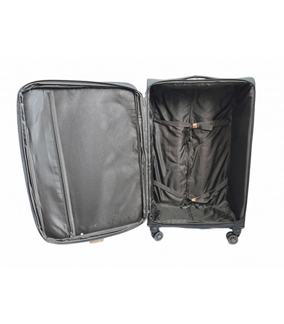 Каркас этого чемодана состоит из гибких полипропиленовых пластин и уплотненного дна, за счет чего, не только прекрасно держит свою форму, но и позволяют сохранять в целости все предметы находящиеся в середине. Одежда может быть аккуратно закреплена на фиксирующих ремнях. Также в середине чемодана размещен большой боковой карман-сетка, извне, для небольших вещей расположен карман в который удобно складывать все, что необходимо в дороге.
