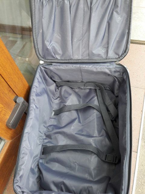 Внутри ? одно большое основное отделение с ремнями фиксации багажа. .Сверху и сбоку чемодана расположены ручки для переноски в вертикальном или горизонтальном положениях. На боковой стороне чемодана маленькие ножки для защиты и устойчивости чемодана в горизонтальном положении. Внутри чемодана под подкладкой расположена металлическая скоба для прочности каркаса, которая не влияет на его вес.
