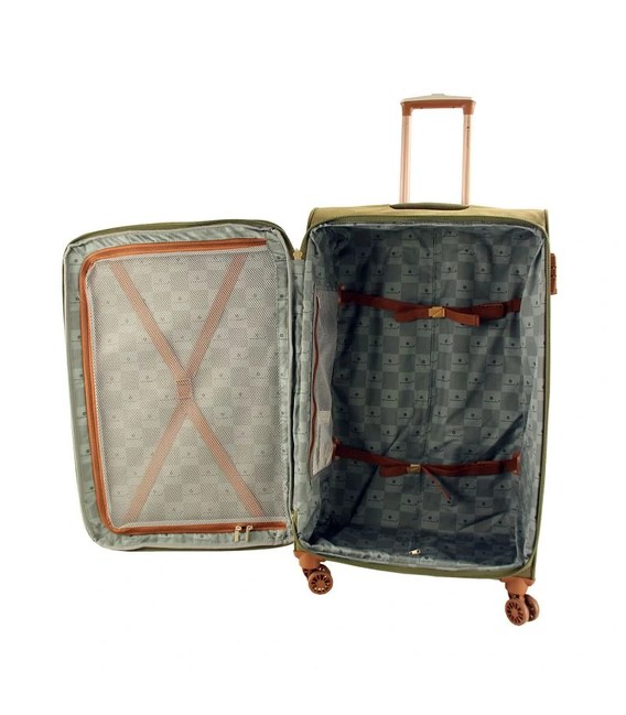 Материал чемодана прочный полиэстер. Данная модель очень вместительная, а также имеет дополнительную молнию расширитель. Внутри большой лоток с ремнями фиксаторами, а также карман на дверце. На передней стенке дополнительный карман.