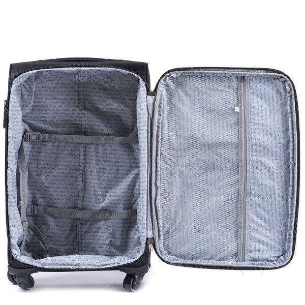Спереди чемодана расположено два больших кармана на молниях, внутри есть одно большое отделение и внутренний карман из прочной сетки. Также есть молния для увеличения объёма. Сзади расположено адресное окно.