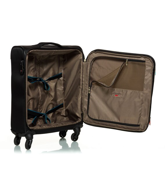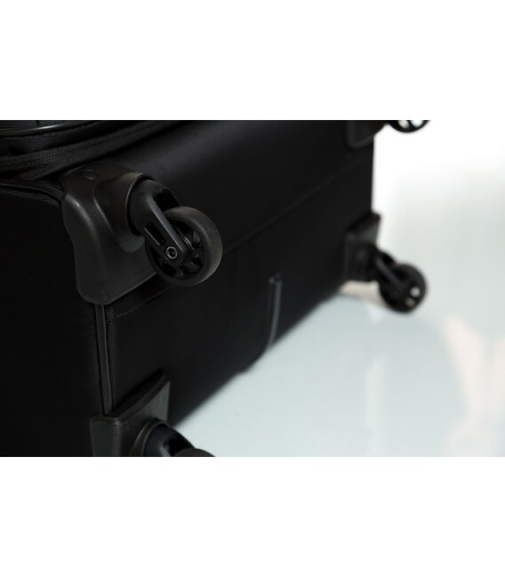 Чемодан оснащен четырьмя прочными колесами. На верхней панели расположена текстильная подъемная ручка, для удобства перемещения есть телескопическая ручка. На фронтальной поверхности расположен глубокий карман, закрывающийся на молнию, а также небольшой карман на молнии с двумя бегунками и сдерживающими углами.