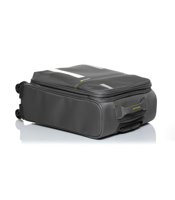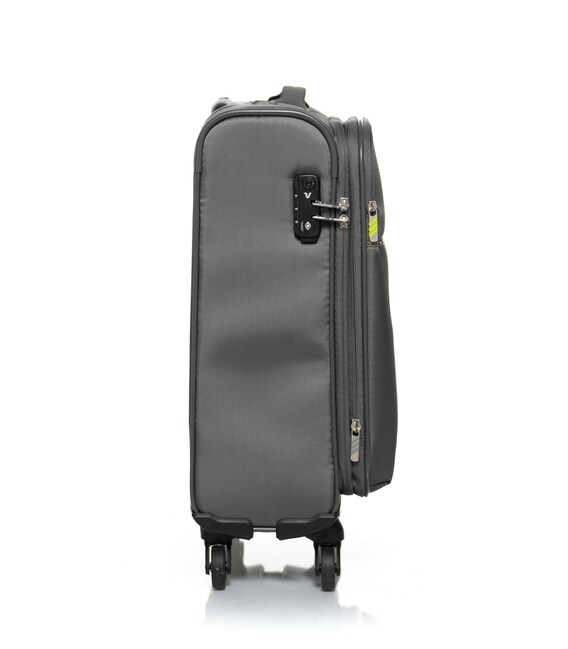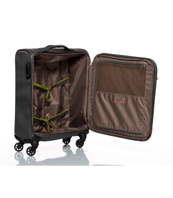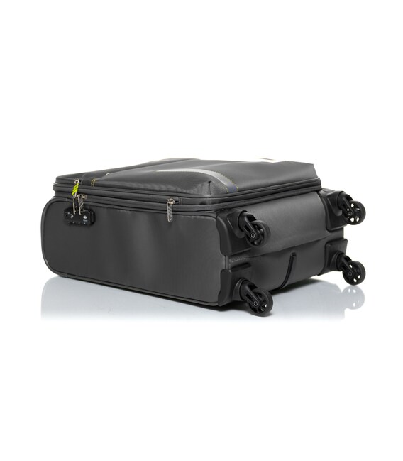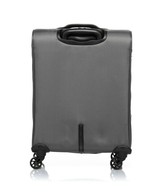 Чемодан оснащен четырьмя прочными колесами. На верхней панели расположена текстильная подъемная ручка, для удобства перемещения есть телескопическая ручка. На фронтальной поверхности расположен глубокий карман, закрывающийся на молнию, а также небольшой карман на молнии с двумя бегунками и сдерживающими углами.