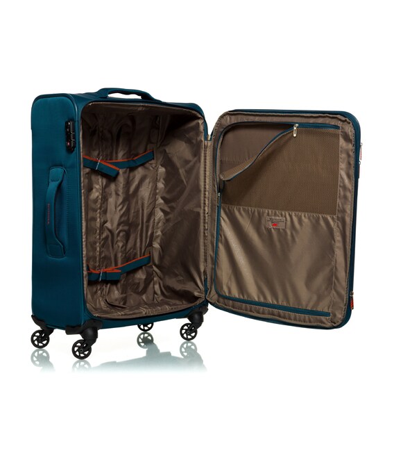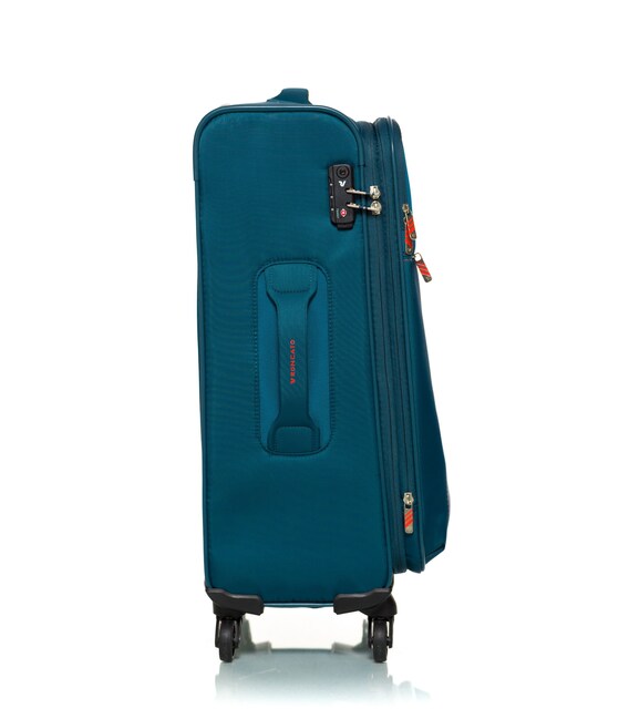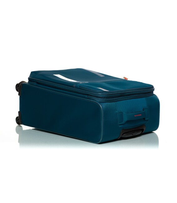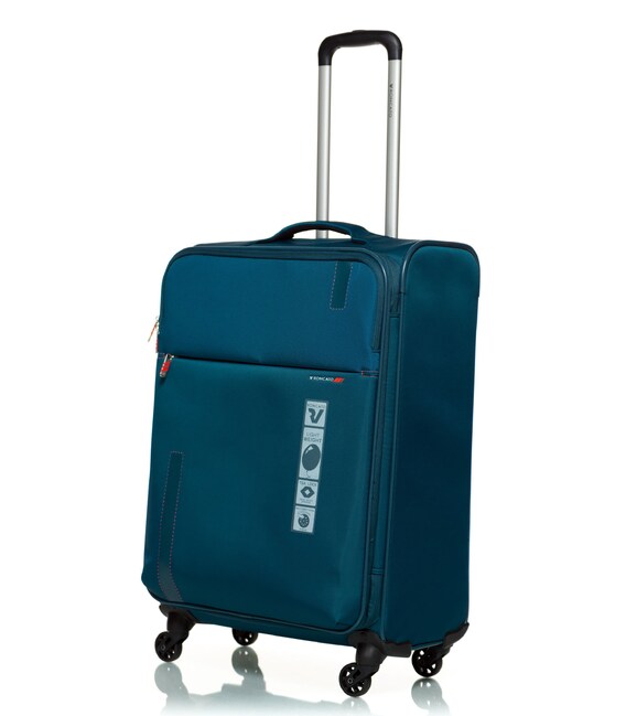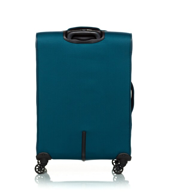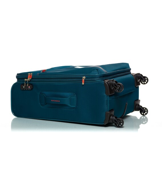 Чемодан оснащен четырьмя прочными колесами. На боковой поверхности и сверху расположены текстильные подъемные ручки, для удобства перемещения есть телескопическая ручка. На фронтальной поверхности расположен глубокий карман, закрывающийся на молнию, а также небольшой карман на молнии с двумя бегунками и сдерживающими углами.