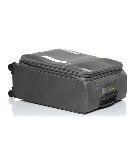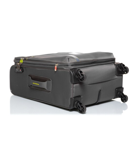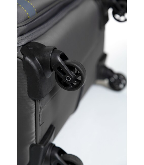 Чемодан оснащен четырьмя прочными колесами. На боковой поверхности и сверху расположены текстильные подъемные ручки, для удобства перемещения есть телескопическая ручка. На фронтальной поверхности расположен глубокий карман, закрывающийся на молнию, а также небольшой карман на молнии с двумя бегунками и сдерживающими углами.
