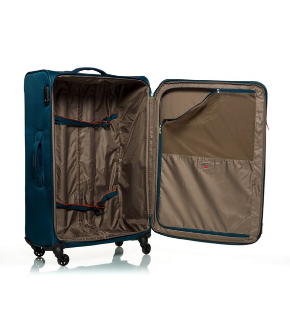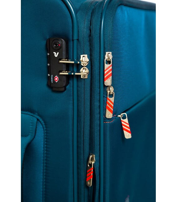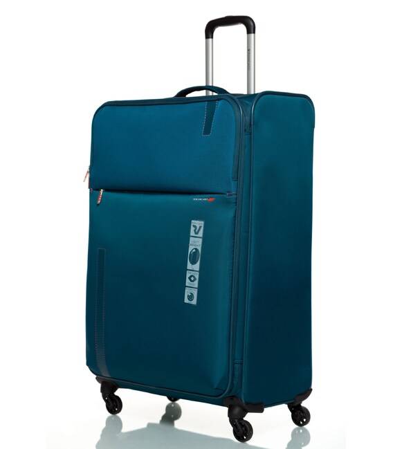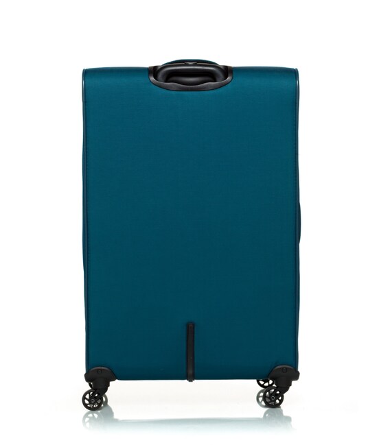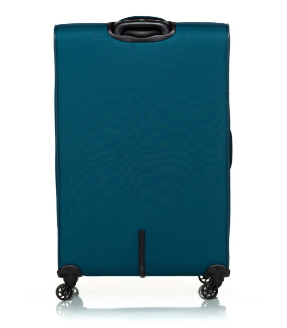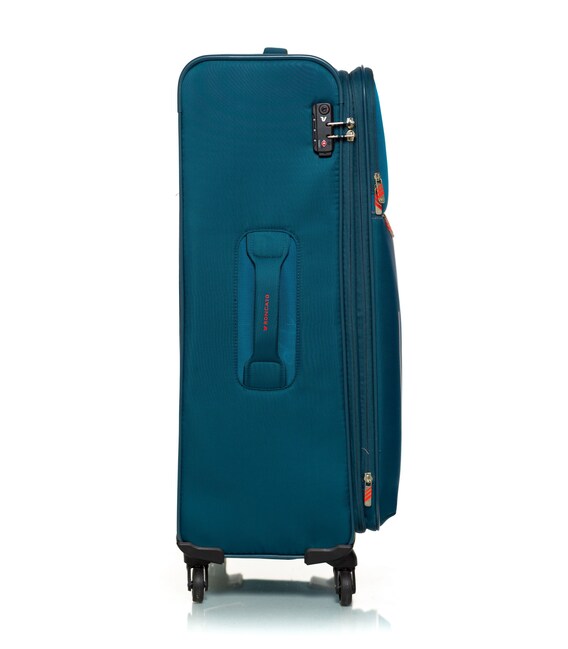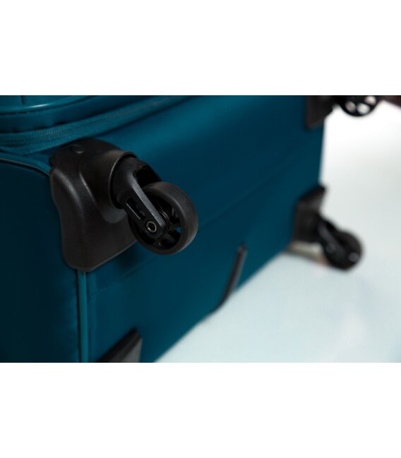 Чемодан оснащен четырьмя прочными колесами. На боковой поверхности и сверху расположены текстильные подъемные ручки, для удобства перемещения есть телескопическая ручка. На фронтальной поверхности расположен глубокий карман, закрывающийся на молнию, а также небольшой карман на молнии с двумя бегунками и сдерживающими углами.