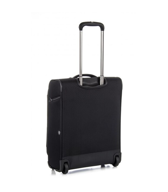 Маленький чемодан оснащен двумя прочными колесами и двумя ножками. Для удобства перемещения есть телескопическая ручка и текстильная подъемная ручка сверху.