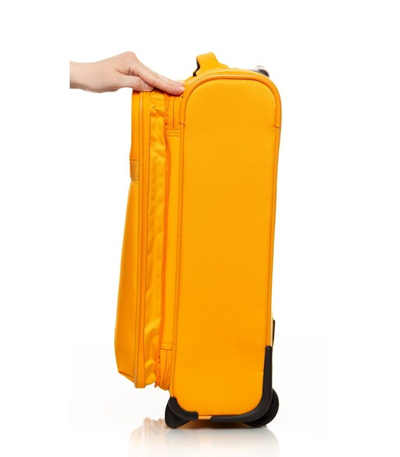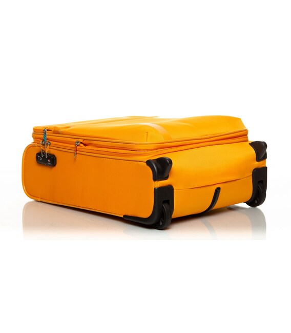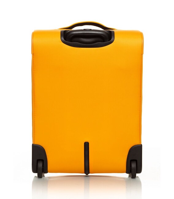 Чемодан оснащен двумя прочными колесами. На верхней панели расположена текстильная подъемная ручка, для удобства перемещения есть телескопическая ручка. На фронтальной поверхности расположен глубокий карман, закрывающийся на молнию, а также небольшой карман на молнии с двумя бегунками и сдерживающими углами.