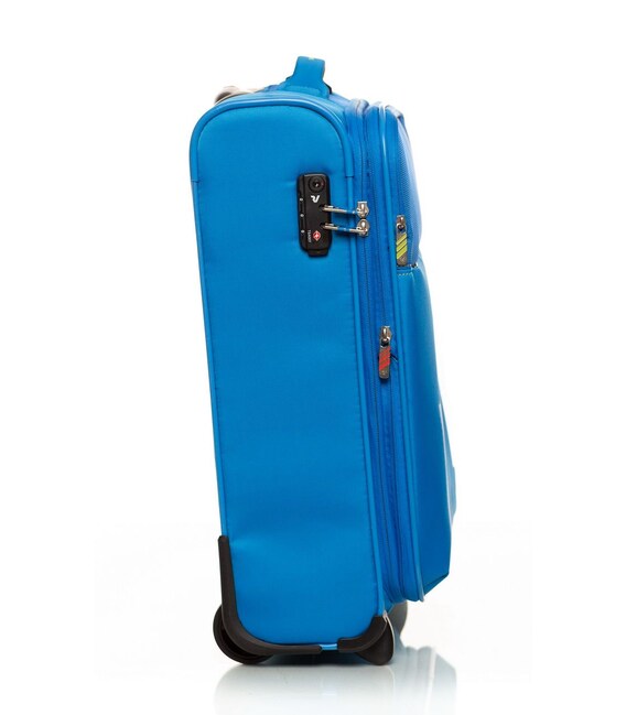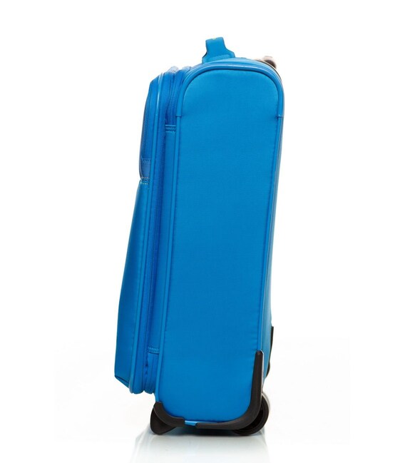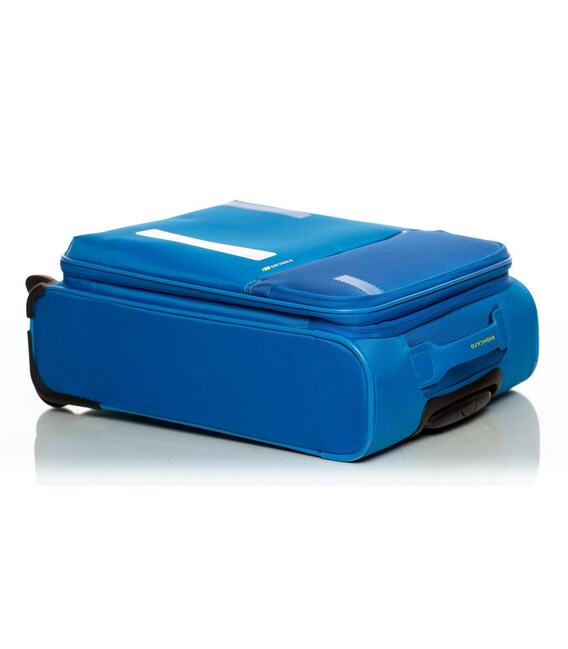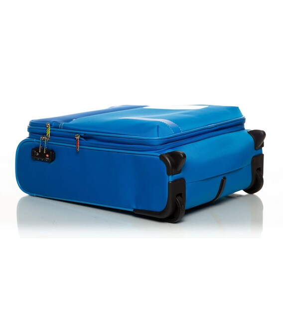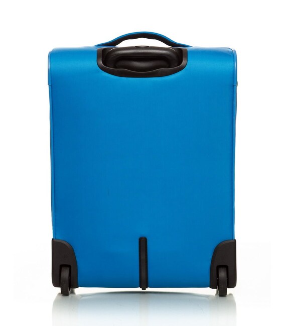 Чемодан оснащен двумя прочными колесами. На верхней панели расположена текстильная подъемная ручка, для удобства перемещения есть телескопическая ручка. На фронтальной поверхности расположен глубокий карман, закрывающийся на молнию, а также небольшой карман на молнии с двумя бегунками и сдерживающими углами.