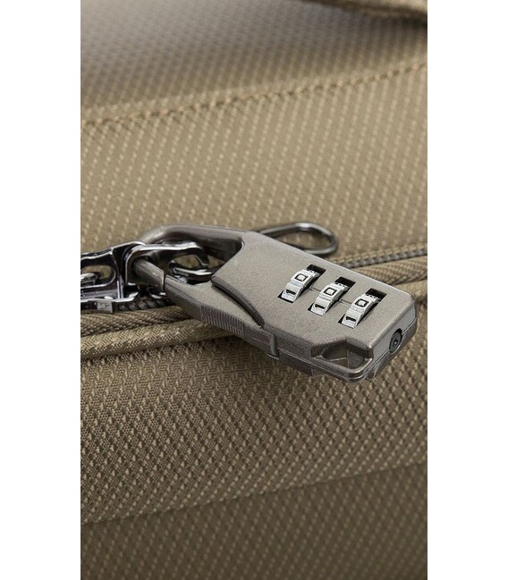 Аксессуар закрывается на молнию, имеет навесной кодовый замок. Внутри чемодана - два отделения, одно оснащено прижимными ремнями, второе - текстильной крышкой на молнии.