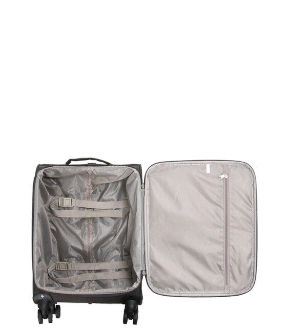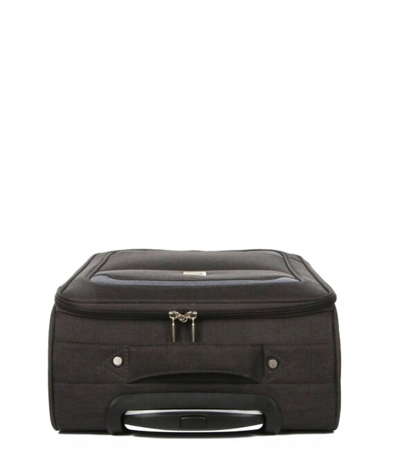На передней панели чемодана есть карман для мелочей и документов. Сверху и сбоку чемодана расположены ручки для переноски в вертикальном или горизонтальном положениях. На боковой стороне чемодана маленькие ножки для защиты и устойчивости чемоданы в горизонтальном положении.