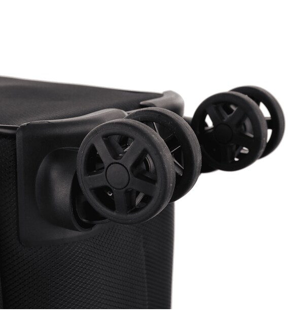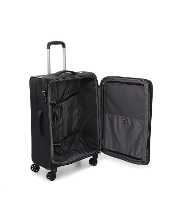 Средний тканевый чемодан имеет возможность увеличить объем до 108 литров за счет расширения, выполнен из комбинации нейлона 840d и полиэстера, что обеспечивает износостойкость. Чемодан закрывается на молнию, оснащен кодовым замком с системой TSA, что несомненно удобно при перелетах, так как позволит службам аэропорта при необходимости исследовать содержимое багажа, не причиняя вреда Вашей собственности. Четыре маневренных колеса поворачиваются на 360̊. Телескопическая ручка с фиксацией, также есть прочные текстильные ручки на боковой и верхней поверхности, для удобства переноски. Фронтальная поверхность оригинально декорирована, на ней расположен глубокий карман для вещей первой необходимости.