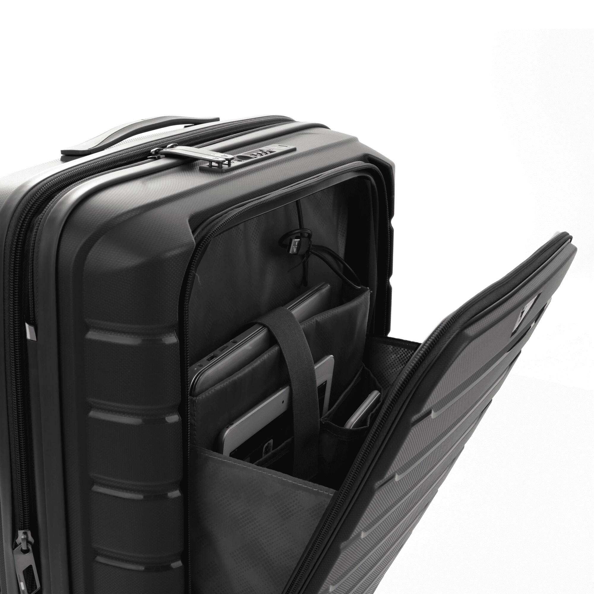 Маленький чемодан оснащен 4 спаренными, бесшумными и маневренными колесами. Для удобства перемещения предусмотрена гибкая, подъемная пластиковая ручка на верхней панели, а также телескопическая ручка. Безопасность и сохранность багажа обеспечивает встроенный кодовый замок с системой TSA. Чемодан закрывается на молнию и имеет отличную внутреннюю организацию.