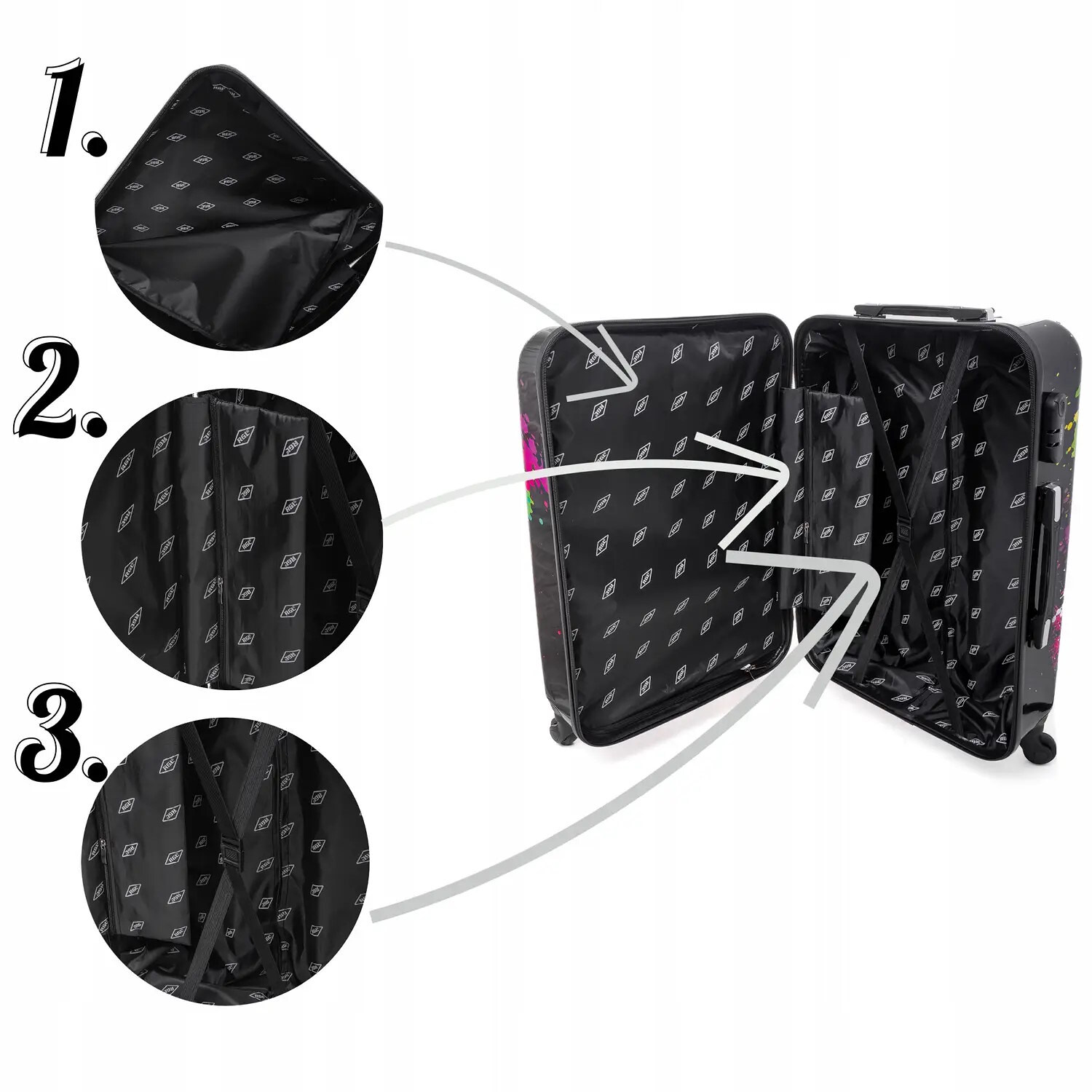 Чемодан имеет яркий и уникальный дизайн с разнообразными принтами, которые привлекают внимание. Внутреннее просторное отделение оснащено ремнями для фиксации вещей, что помогает сохранять порядок во время поездки. Наружный материал защищает от влаги и загрязнений, обеспечивая надежность в любых условиях.