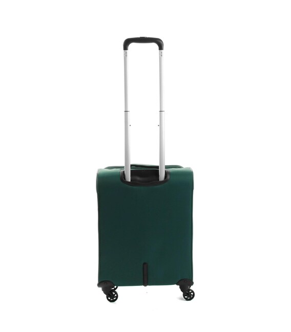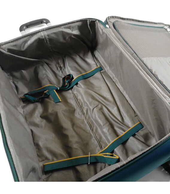 Чемодан оснащен четырьмя прочными колесами. На верхней панели расположена текстильная подъемная ручка, для удобства перемещения есть телескопическая ручка. На фронтальной поверхности расположен глубокий карман, закрывающийся на молнию, а также небольшой карман на молнии с двумя бегунками и сдерживающими углами.