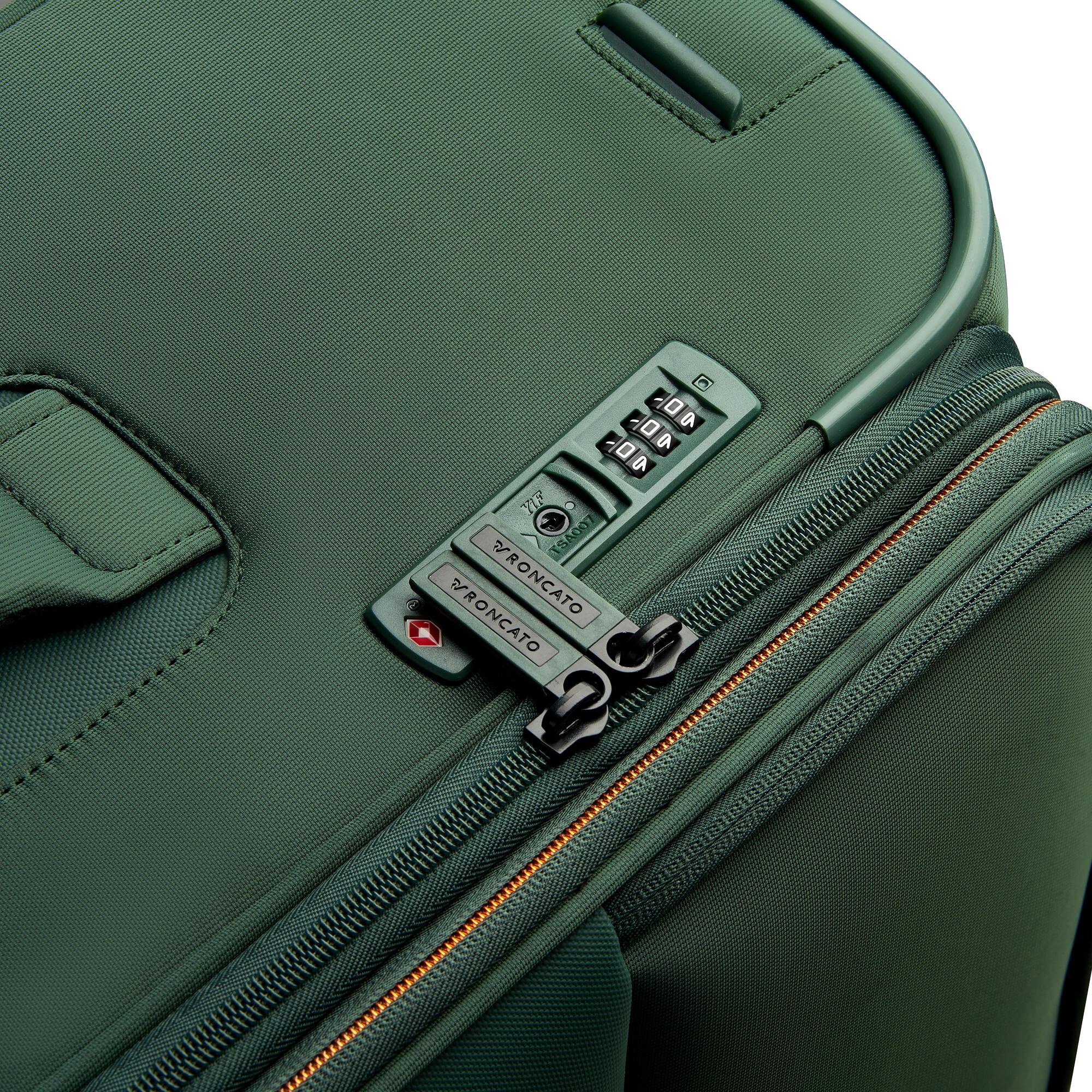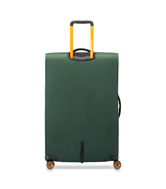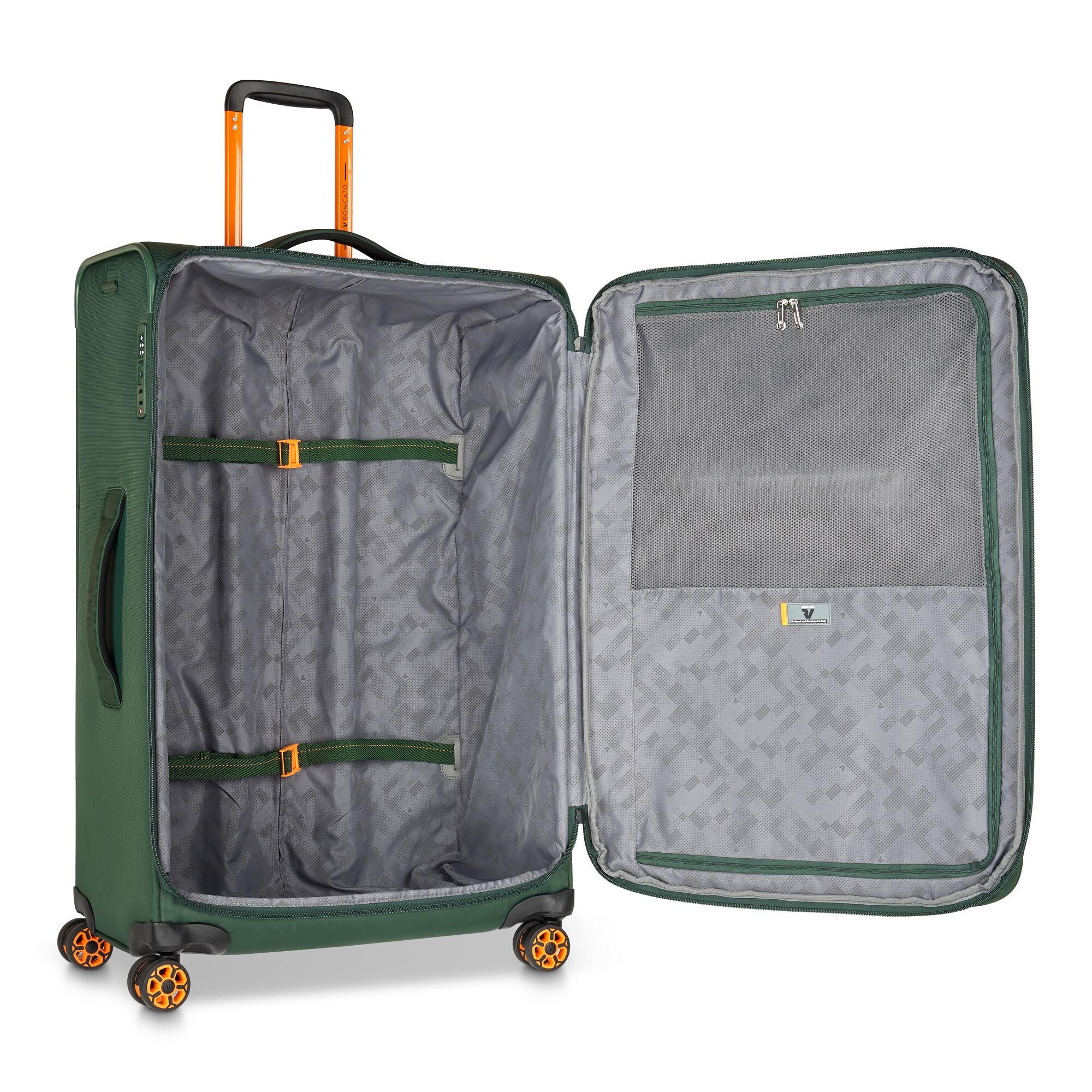 Большой чемодан с расширяющейся системой для увеличения внутреннего пространства закрывается на двойную молнию «High tech security», которая предотвращает несанкционированное сечение чемодана. Также для безопасности багажа предусмотрен кодовый замок с TSA системой. Внутренняя часть изделий снабжена эластичными ремнями для крепления одежды, перегородками и карманами для мелких вещей. Снаружи есть еще два легкодоступных отделения, адресник и две эргономичные ручки для облегчения подъема чемодана. Также четыре спаренных колеса возвращаются на 360°.