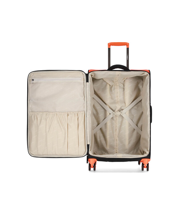 Вона має продумане внутрішнє відділення з ременями-фіксаторами, кишені-органайзери та сітчастий відсік, а спереду дві кишені для швидкого доступу до необхідного. Завдяки вбудованому кодовому замку вміст валізи надійно захищений, тож можна не хвилюватися за безпеку багажу під час подорожей.