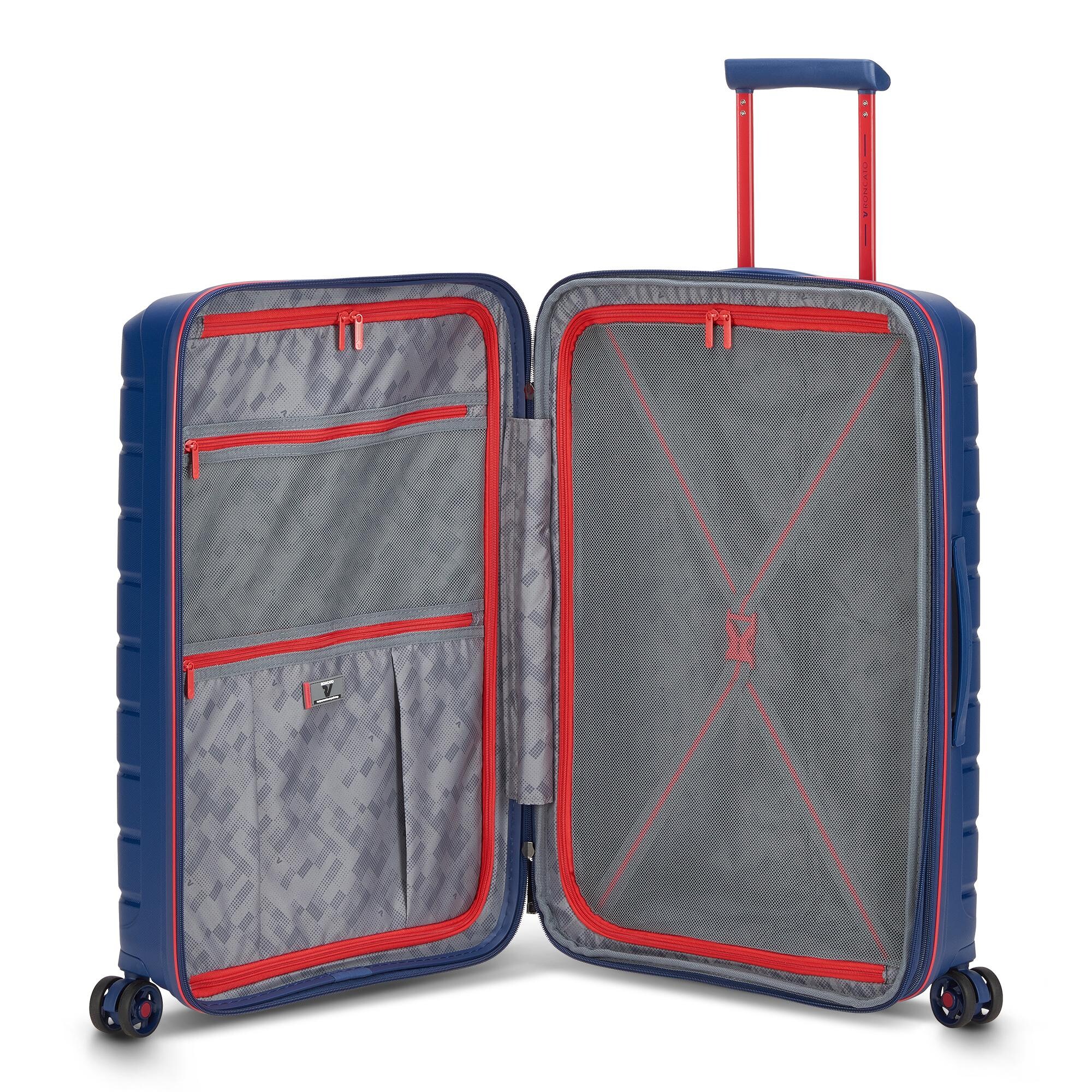 Середній чемодан оснащений 4 спареними, безшумними і маневреними колесами. Для зручності переміщення передбачені еластичні, підйомні пластикові ручки на верхній і бічний панелях, а також телескопічна ручка. Безпека і збереження багажу забезпечує вбудований кодовий замок з системою TSA. Чемодан закривається на блискавку і має відмінну внутрішню організацію.