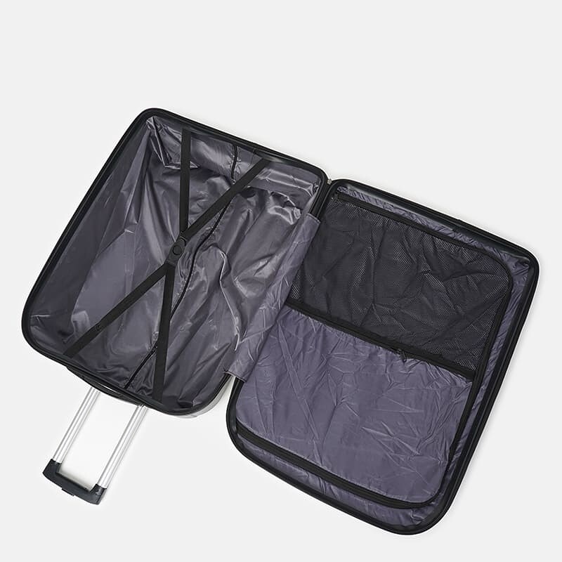 Модель оснащена спаренными колесами, вращающимися на 360°. Выдвижная телескопическая, алюминиевая ручка с двумя уровнями фиксации. Кодовый замок, для защиты ваших личных вещей. Две ручки из силикона в верхней и боковой части чемодана для транспортировки в вертикальном и горизонтальном положении. Пластиковые ножки для расположения чемодана в горизонтальноим положении. Чемодан имеет 1 основное отделение с перегородкой из полиэстра, на перегородке имеется 1 дополнительное сетчатое отделение. Эластичные компрессионные ремни на фастексе предназначены для фиксации вещей внутри чемодана. Также чемодан имеет молнию на подкладке с двух сторон, для доступа к внутреней части чемодана где находятся колёса и механизм ручки. Высота чемодана без учета колес - 68см.