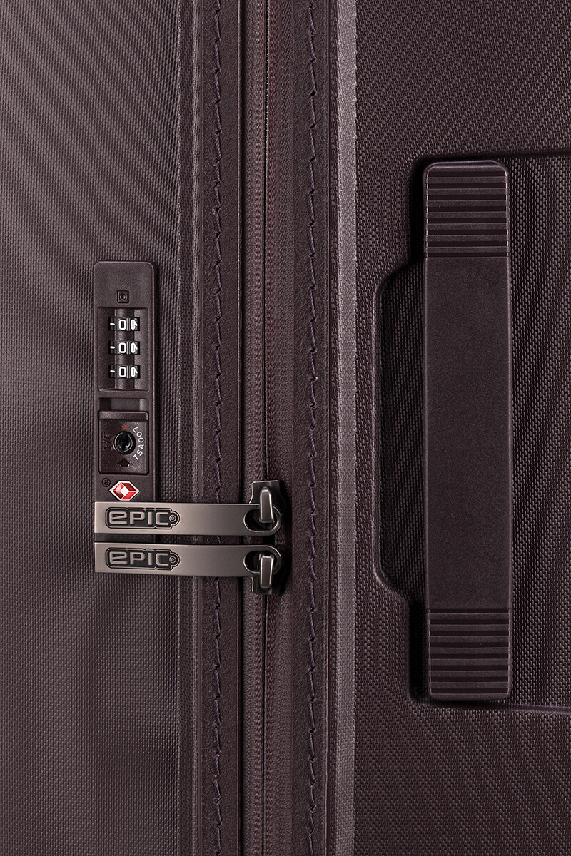 Чемодан оснащен четырьмя двойными колесами с улучшенной маневренностью, также колеса выполнены из мягкой, но прочной и тихой смеси, которые поддерживаются двойными герметичными картриджными подшипниками для дополнительной плавности и более длительного срока службы. Дополнительно, колеса имеют EPIC Standard™ – система легкосменных колес. Еще из особенностей данной модели - это молния, высокая водонепроницаемость благодаря своей прорезиненной поверхности и отвечающая самым высоким стандартам гибкости и долговечности в эксплуатации. Для удобства перемещения имеются выдвижные телескопические ручки и подъемные ручки на верхней и боковой поверхностях.
