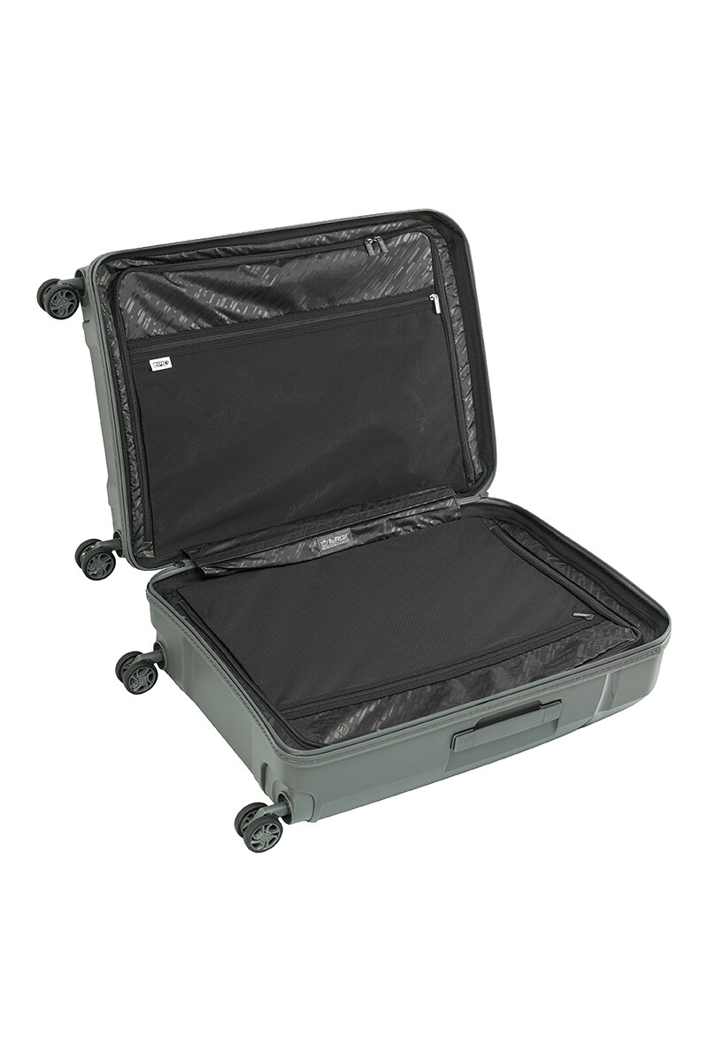 Аксессуар оснащен встроенным кодовым замком с системой TSA. Внутри два отделения оснащены прижимными ремнями, в одном из которых есть сетчатая крышка на молнии. Также, поддерживать чистоту и свежите чемоданы поможет съемная подложка, которую можно постирать при 30°.