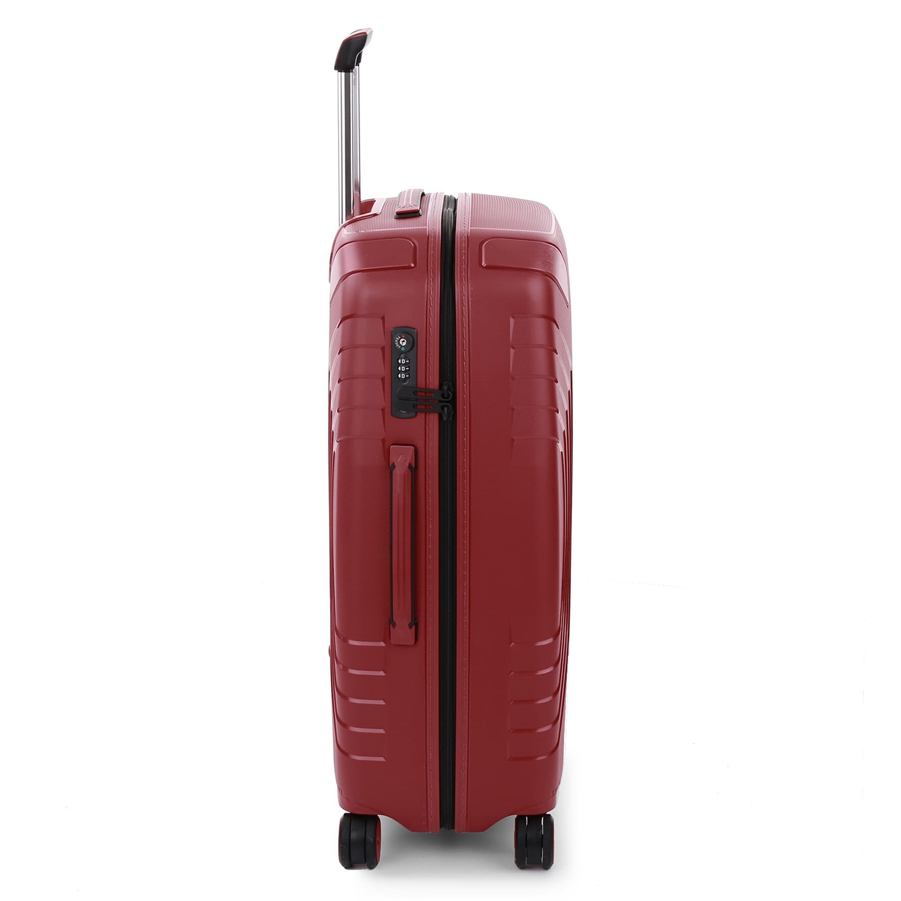 Средний чемодан подходит для путешествий на длительное время. Выполнен из 100% полипропилена, материал, который обладает гибкостью, необыкновенной ударопрочностью и стойкостью к деформациям и выгоранию. Для удобства перемещения чемодан оснащен четырьмя спаренными колесами, вращающимися на 360 градусов, регулируемой телескопической ручкой и ручкой для переноски на верхней и боковой части чемодана.