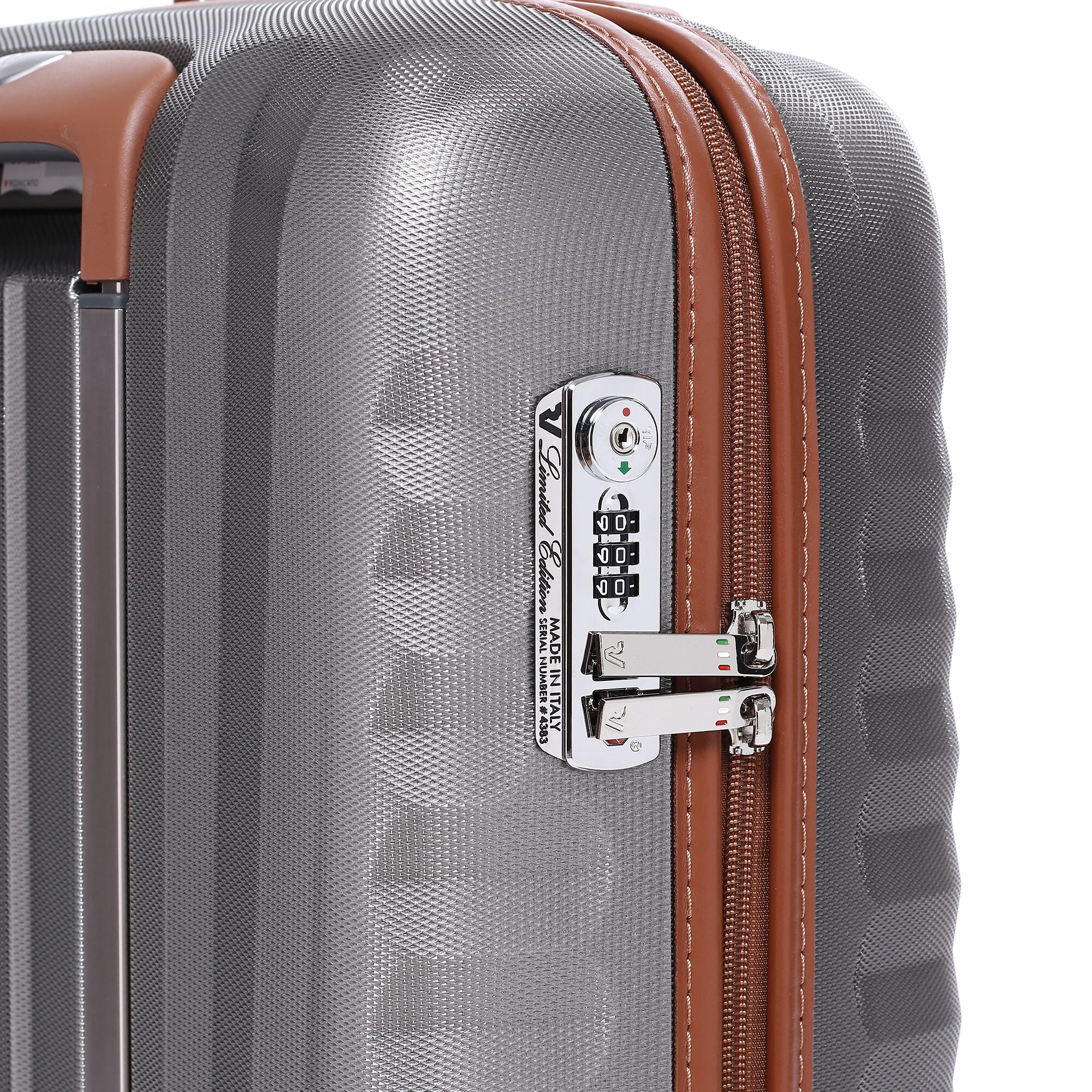Велика валіза виконана зі 100% полікарбонату з алмазним покриттям, що служить повним захистом від механічних пошкоджень. Фурнітура валізи, а саме блискавка, підйомні ручки, адресна бирка і внутрішні деталі, оброблені високоякісною шкірою. Все це надає неповторний вінтажний вид аксесуару. Ще однією перевагою є наявність унікального серійного номера, що підкреслює неповторність даної моделі, а також значно полегшить процес пошуку валізи, в разі його втрати.