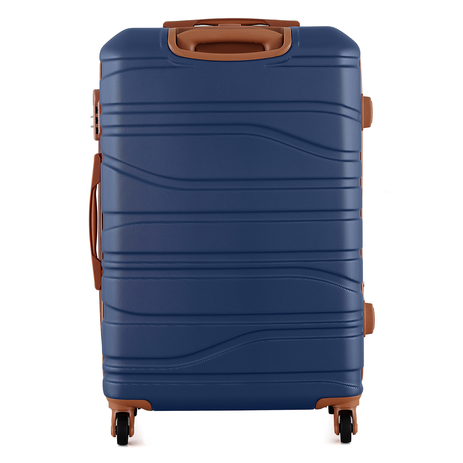 Корпус имеет рифленое покрытие, которое скрывает мелкие царапины, а кодовый замок защищает содержимое чемодана. Чемодан оснащен четырьмя полноповоротными колесами на 360°, обеспечивающими маневренность и устойчивость, а также телескопической ручкой, которая фиксируется в трех положениях. Внутреннее пространство разделено текстильной перегородкой с карманом на молнии, есть эластичные компрессионные ремни для фиксации одежды. Для удобства транспортировки предусмотрены верхняя ручка с мягкой гелевой подкладкой и боковая ручка.