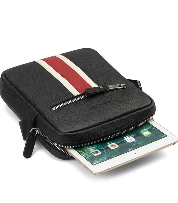 Вертикальная сумка через плечо, изготовленная из натуральной кожи. Оснащен глубоким основным отделением с отделами для смартфона, планшета 11" и пишущих предметов. С внешней стороны сумки размещен небольшой карман для вещей первой необходимости. Также, задняя часть изделия оснащена дополнительным карманом на молнии. Для удобства переноски сумка оборудована ремнем .
