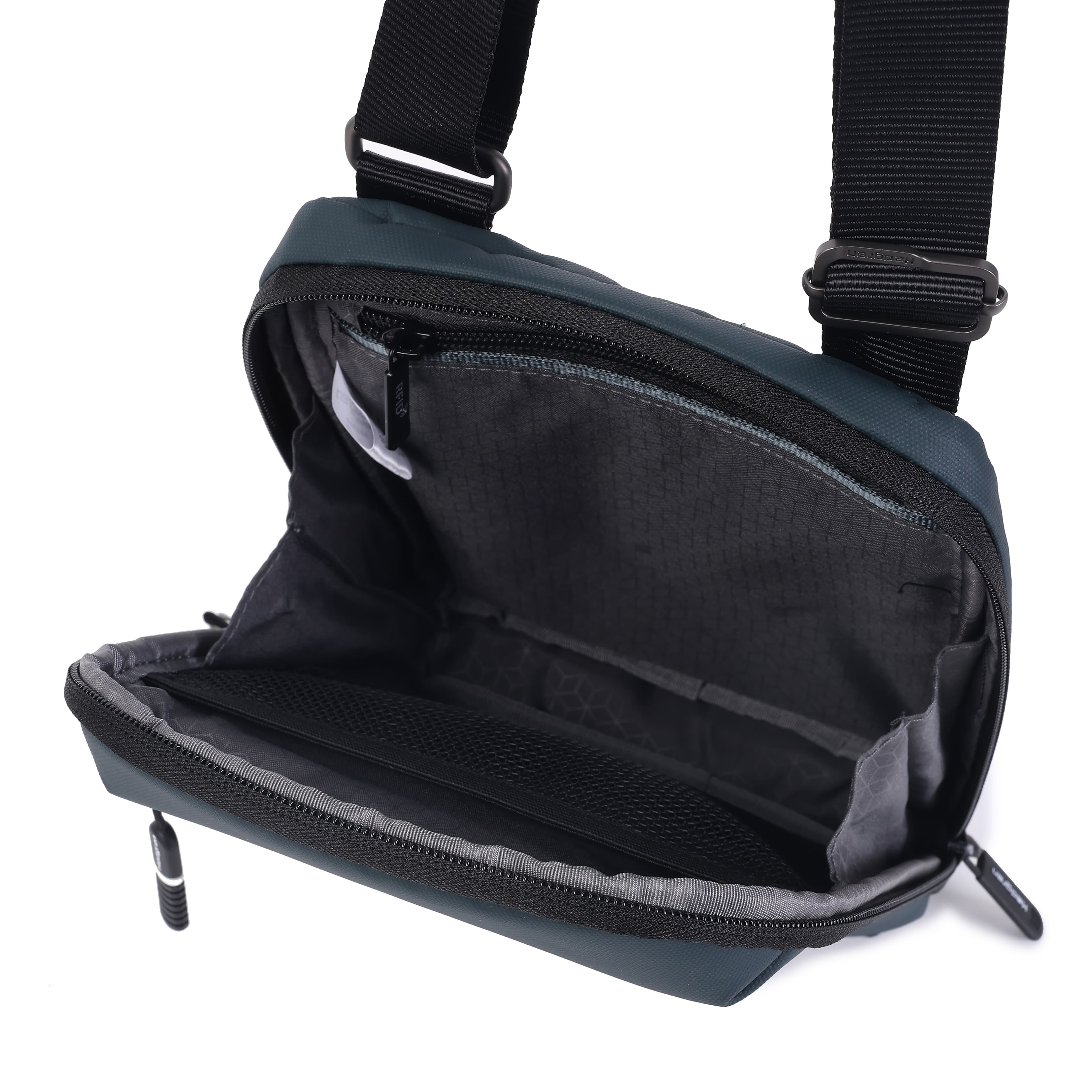 Продукт изготовлен из переработанных материалов с водоотталкивающим покрытием. Сумка кроcсовер, не большого размера, идеально подходит для повседневного использования, позволит освободить руки и поместить вещи первой необходимости, например: ключи, смартфон, портмоне. Оснащена одним основным отделением в котором есть внутренний отдел для мини-планшета или смартфона 9" и карман на молнии с RFID-защитой от мошенничества. фурнитура и стильный дизайн.