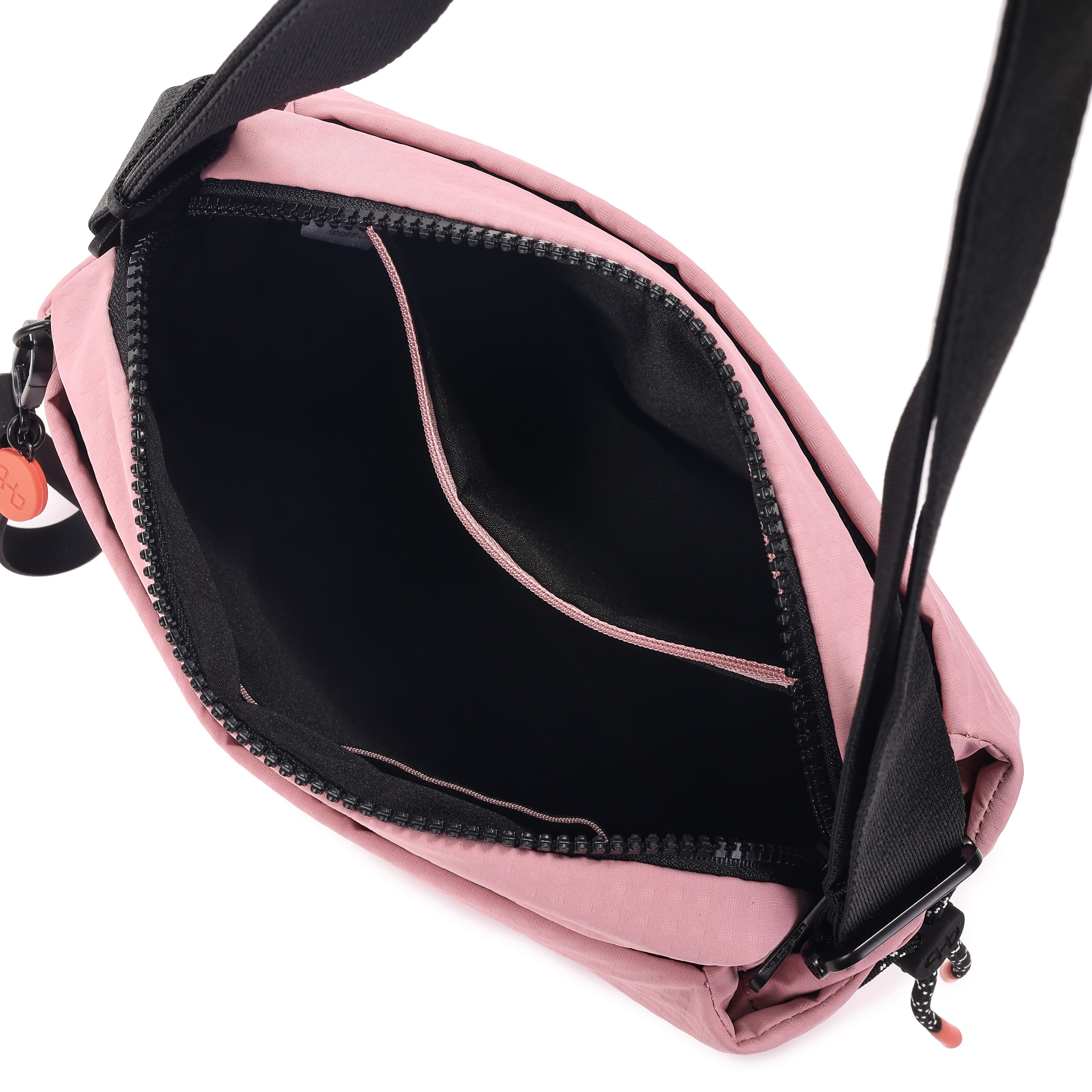 Зручна, компактна сумка, середнього розміру виготовлена з переробленої тканини. Оснащена основним відділенням на блискавці з відділом для смартфону, та додатковою кишенею на блискавці. Зовні оснащена кишенями з обох боків, для предметів першої необхідності. На задній кишені виробу, передбачено втоплену блискавку, яка щільно прилягає до тіла, як додатковий засіб безпеки. Також, за потребою сумка розширюється і має бокові кишені для пляшки/парасольки. Сумку можна носити через плече завдяки регульованому, знімному ременю.