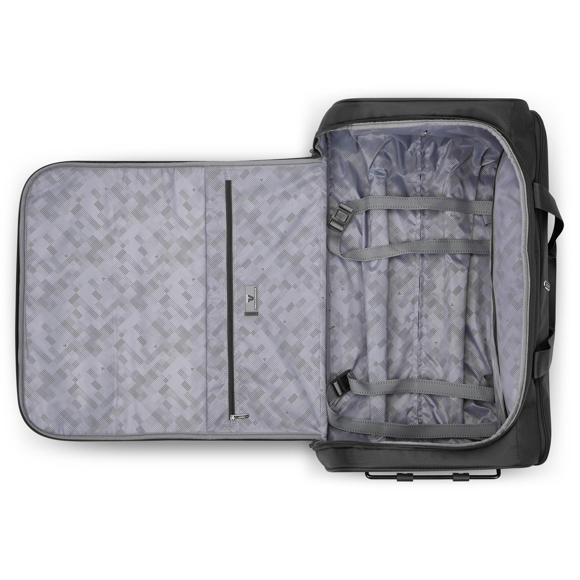 Дорожня сумка колесах, зручний варіант для подорожей. Зовнішня тканина виготовлена з нейлону та поліестеру для забезпечення довговічності та легкості, а внутрішня підкладка виготовлена з 100% переробленого RPet. Оснащена містким основним відділенням з притискними ременями і зовнішньою кишенею для предметів які потрібні під рукою. Для зручності переміщення оснащена: телескопічною ручкою, з'єднувальними ручками на липучці та додатковою ручкою зверху виробу. На блискавці основного відділення передбачена можливість розміщення навісного замка.