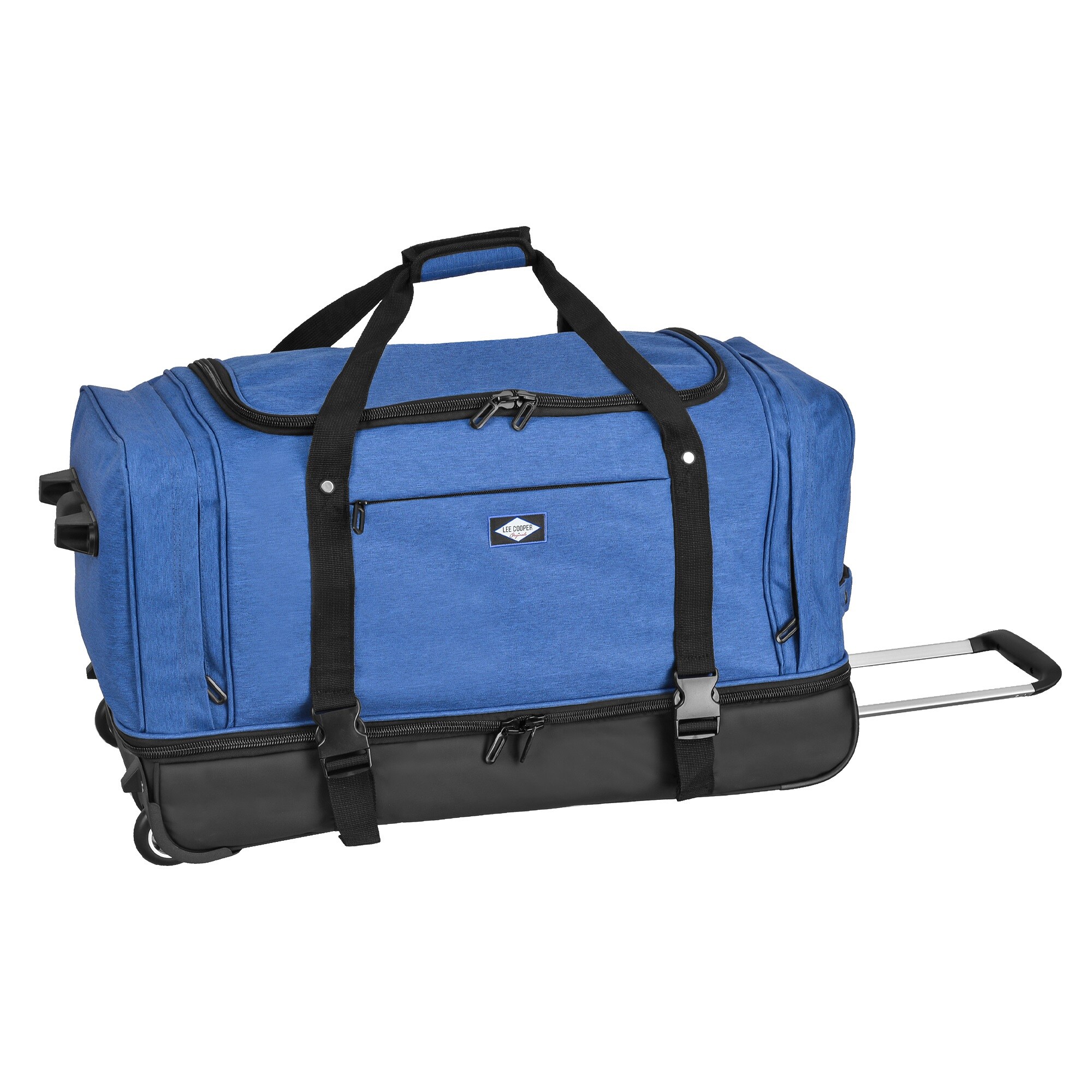 Дорожная сумка Lee Cooper на роликах имеет два основных отделения: первое (в верхней части) идеально подходит для одежды и другого необходимого багажа, а второе (в нижней части) содержит лямки для хранения других видов одежды или оборудование. Два боковых кармана предназначены для хранения обуви или других дорожных вещей, а передний карман предназначен для документов, мобильного телефона или кошелька.