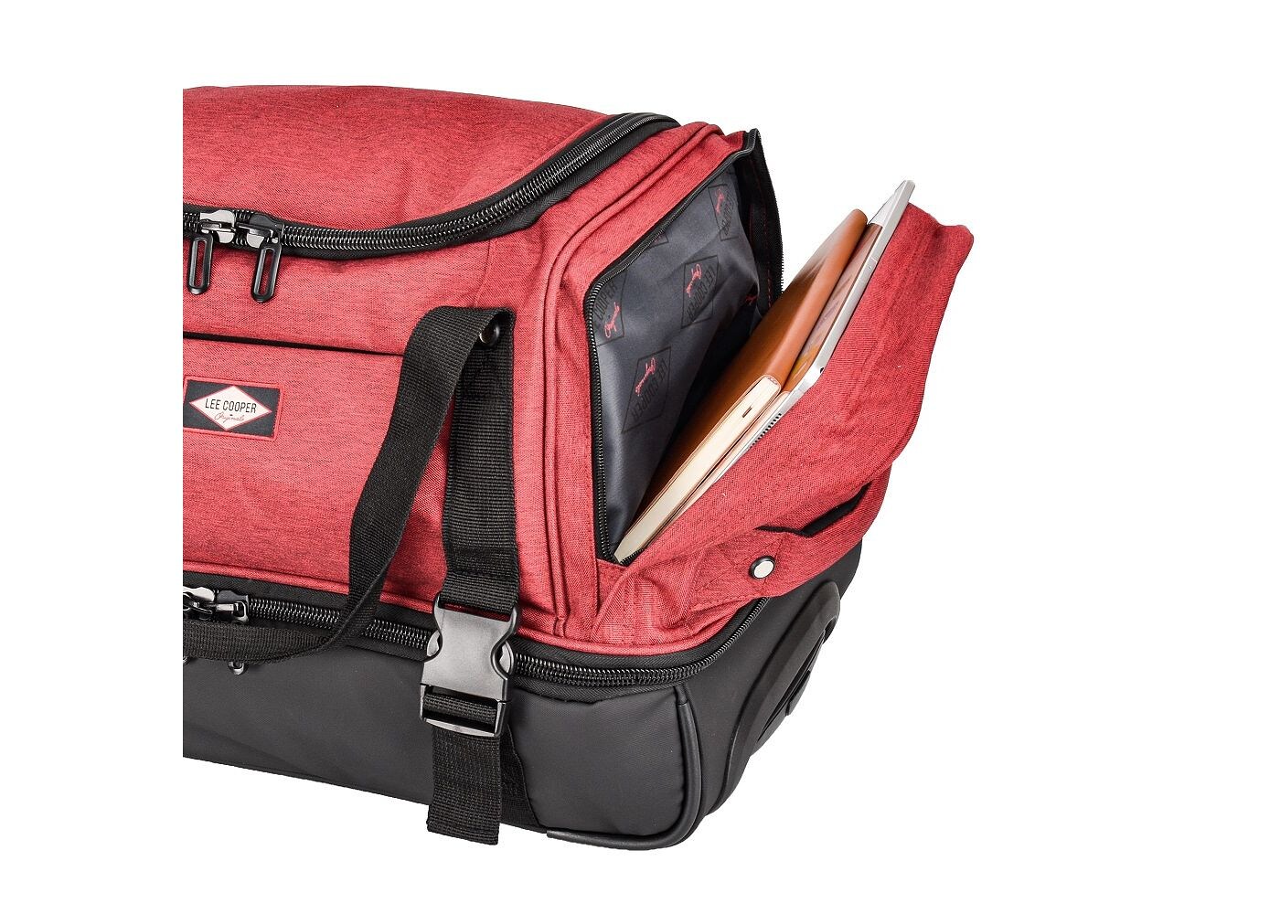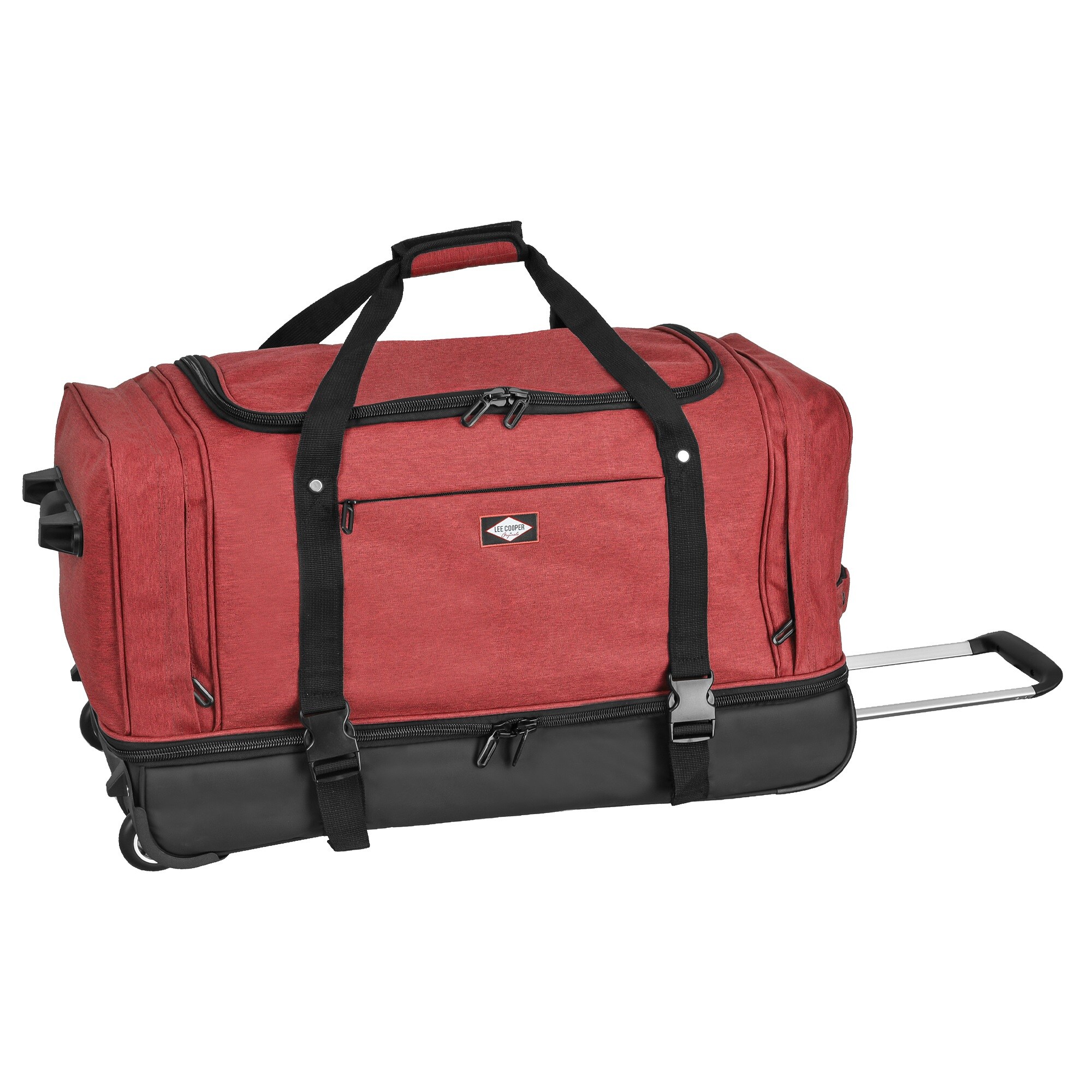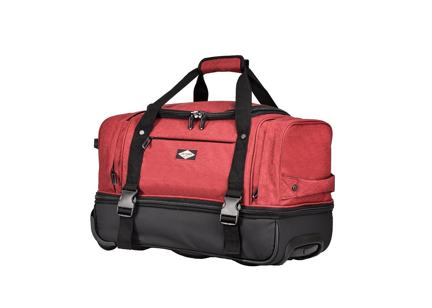 Дорожная сумка Lee Cooper на роликах имеет два основных отделения: первое (в верхней части) идеально подходит для одежды и другого необходимого багажа, а второе (в нижней части) содержит лямки для хранения других видов одежды или оборудование. Два боковых кармана предназначены для хранения обуви или других дорожных вещей, а передний карман предназначен для документов, мобильного телефона или кошелька.