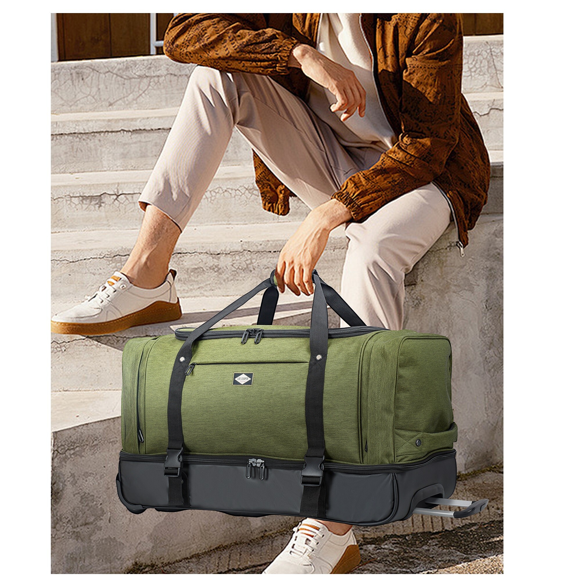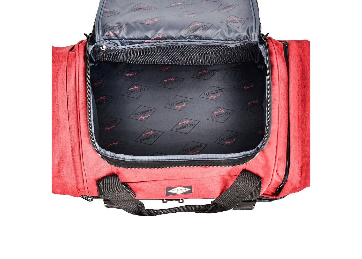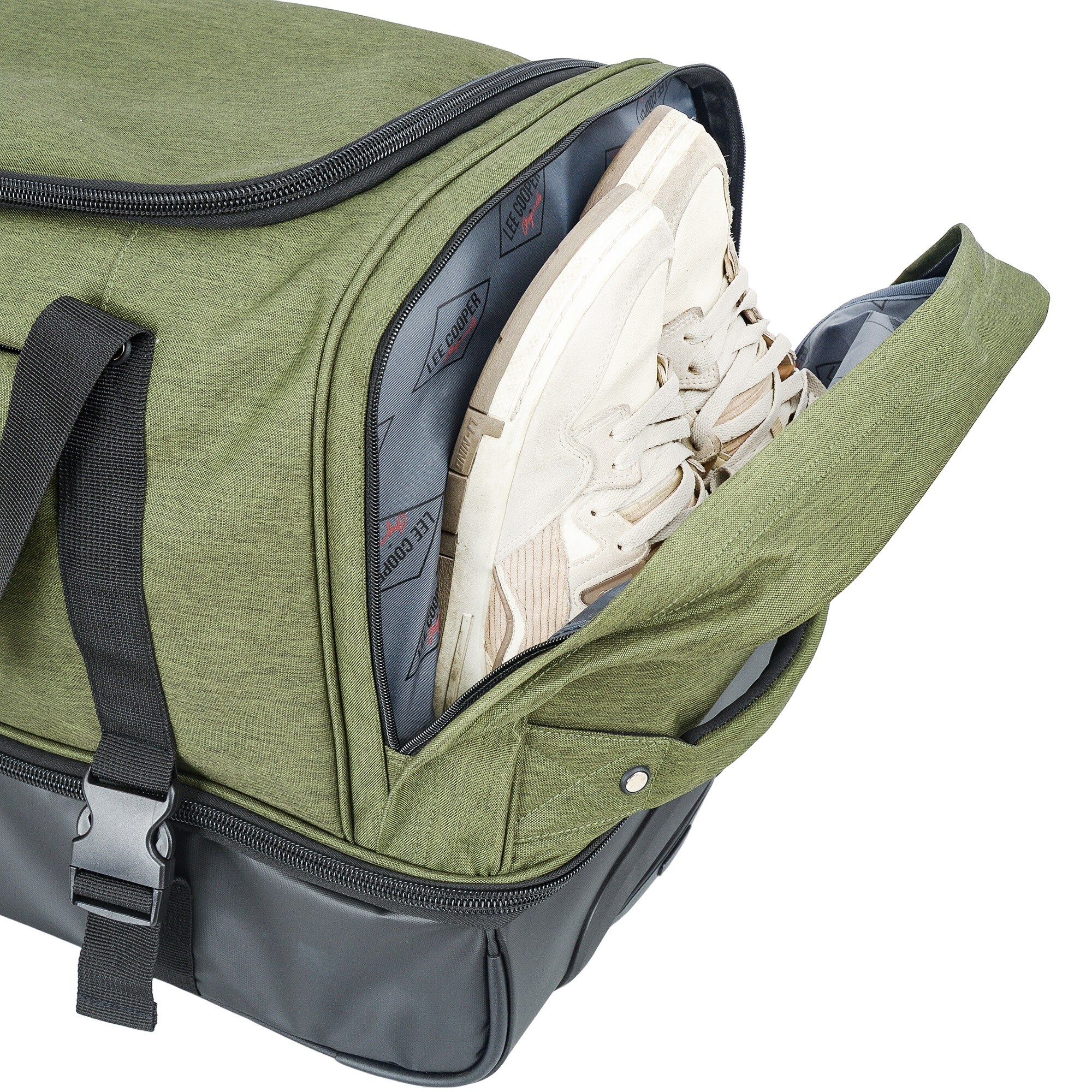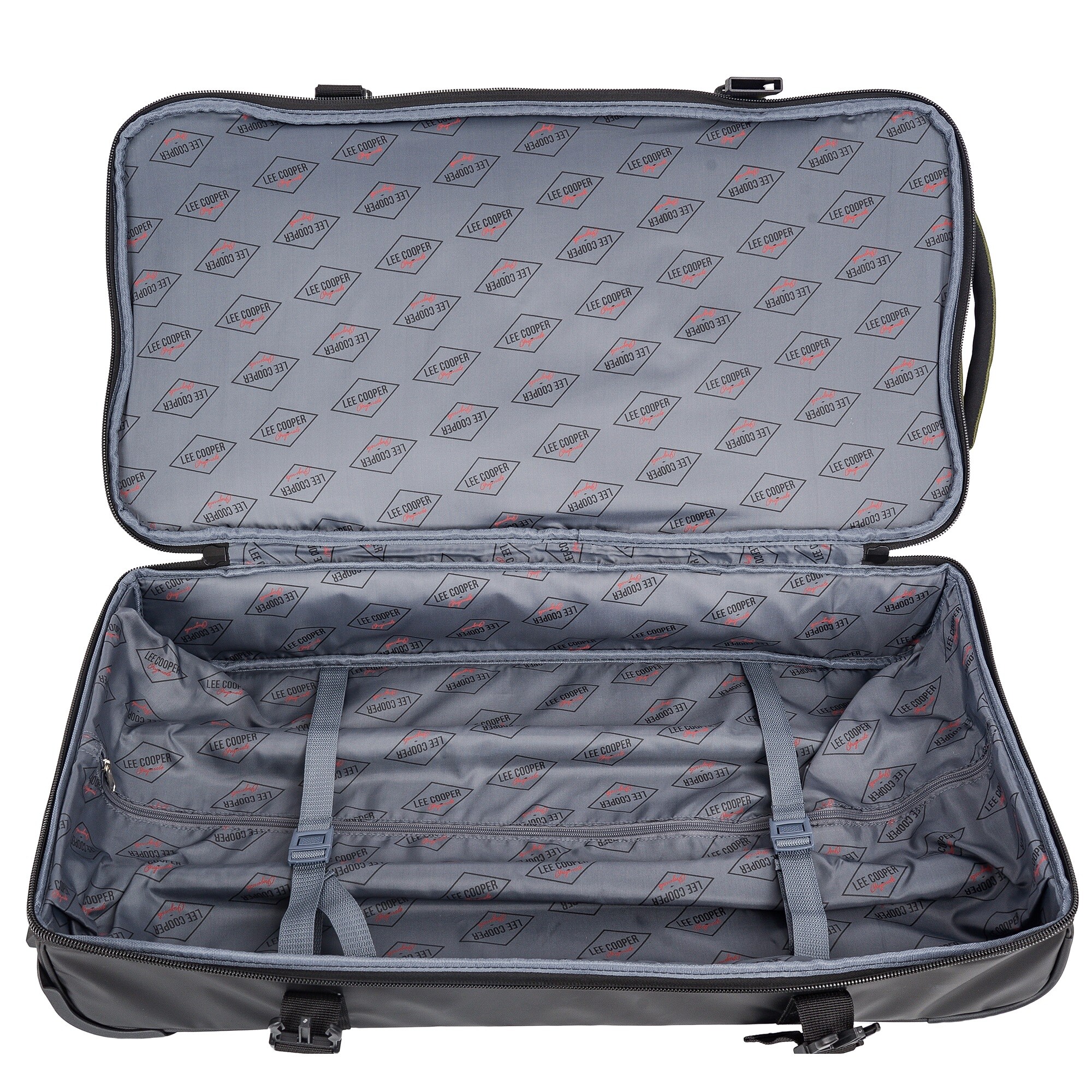 Дорожная сумка Lee Cooper на роликах имеет два основных отделения: первое (в верхней части) идеально подходит для одежды и другого необходимого багажа, а второе (в нижней части) содержит лямки для хранения других видов одежды или оборудование. Два боковых кармана предназначены для хранения обуви или других дорожных вещей, а передний карман предназначен для документов, мобильного телефона или кошелька.