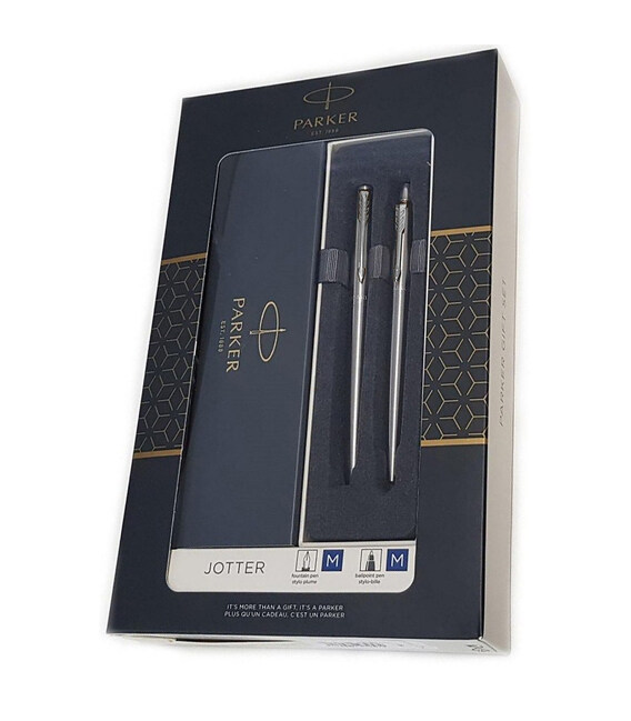 Набор из 2-х ручек Parker JOTTER Stainless Steel CT FP+BP в подарочной упаковке. Изысканный подарок, а также замечательный пишущий инструмент для личного повседневного использования.В набор входит перьевая и шариковая ручки Parker JOTTER в стальном корпусе с полированной хромированной отделкой серебристого цвета. Фирменный зажим в виде стрелы. Красивое стальное перо с гравировкой бренда. Вторая ручка (шариковая) с технологией Quinkflow для плавной подачи чернил и толщиной пишущего узла среднего размера.Ручки комплектуются чернильным картриджем, пишущим синим цветом (перо) и стержнем с синими чернилами (шарик).Джотер – это икона стиля на протяжении последних 60 лет.Ручки Паркер Джотер поставляются в подарочной коробке с сертификатом подлинности. Гарантия – 2-летняя с момента приобретения.