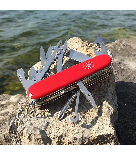 Victorinox DELUXE TINKER (красный) – швейцарский нож 91 мм на 17 функций. Представляет коллекцию средних складных ножей Victorinox. Среди прочего содержит комбинированные плоскогубцы, ножницы и отвертку Phillips. Deluxe Tinker подготовит вас к любой непредвиденной ситуации: вы всегда готовы отремонтировать и исправить что угодно. Все инструменты гарантируют безупречную, долговечную работу, не люфлят. Ножевой замок Slip-joint - это проверенная временем конструкция, которая фиксирует лезвие в положении к рукояти и надежно защищает от запрокидывания во время работы.Информация о ноже Victorinox DELUXE TINKER [1.4723]✔ Изготовлен из высококлассной нержавеющей стали.✔ Красные накладки-рукоять из ударопрочного пластика с логотипом бренда.✔ 17 функций.✔ Средний размера ножа Victorinox (длина х ширина х толщина), мм: 91 х 26 х 22✔ На нож распространяется пожизненная гарантия качества.✔ Картонная коробочка с оригинальным сертификатом.✔ Сделано в Швейцарии.1. большое стальное лезвие2 лезвие меньшего размера3. комбинированные плоскогубцы4. – кусачки для проволоки5. – инструмент для обжима проволоки6. ножницы с пружинным механизмом7. крестообразная отвертка 1/28. открывалка для бутылок9. – плоская отвертка 6 мм10. – паз для устранения изоляции11. открывалка для консервных банок12. – плоская отвертка 3 мм13. шило (дырокол)14. крючок15. пинцет в передней накладке16. зубочистка в задней накладке17. кольцо для крепления Все ножи Victorinox 91 мм с пластиковыми накладками имеют специальное отверстие под булавку в накладке возле штопоре (в комплектацию к данной модели булавка не входит и продается отдельно).