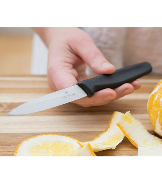 Victorinox Swiss Classic Paring [6.7603] - маленький кухонный нож с черной ручкой.Длина лезвия 8 см и гладкая заточка. Предназначен для очистки овощей, фруктов, а также другой работы, где важна точность и мобильность кухонного ножа. Например, удобно избавить болгарский перец от семечек или нарезать чеснок, зелень. Невероятно острый и долговечный помощник на вашей кухне.Модель представлена в популярной линейке Swiss Classic (Свисс Классик) с самым большим выбором цветных рукоятей, вариантов длины и заточки лезвия. Кухонные ножи Victorinox (Викторинокс) - это высокое качество изготовления и безупречная производительность. Эргономичная ручка со стабильным хватом и профессиональная заводская заточка для легкой и продуктивной эксплуатации.- Для очистки овощей и фруктов; мелкой работы.- Лезвие 8 см.- Режущая кромка: гладкая (Plain).- Лезвие из штампованной нержавеющей стали высокого качества.- Нескользящая ручка из полипропилена.- Разрешено мытье в посудомоечной машине.- Поставляется с защитной пленкой на лезвие.Высококлассная нержавеющая сталь - это фирменный почерк швейцарской ножевой компании Victorinox, которая прославилась производством легендарных складных армейских ножей SAK. Спешите купить кухонный нож Victorinox 6.7603, пока он есть в наличии. Брендовый магазин chemodanoff.com.ua - 100% оригинал от Викторинокс.