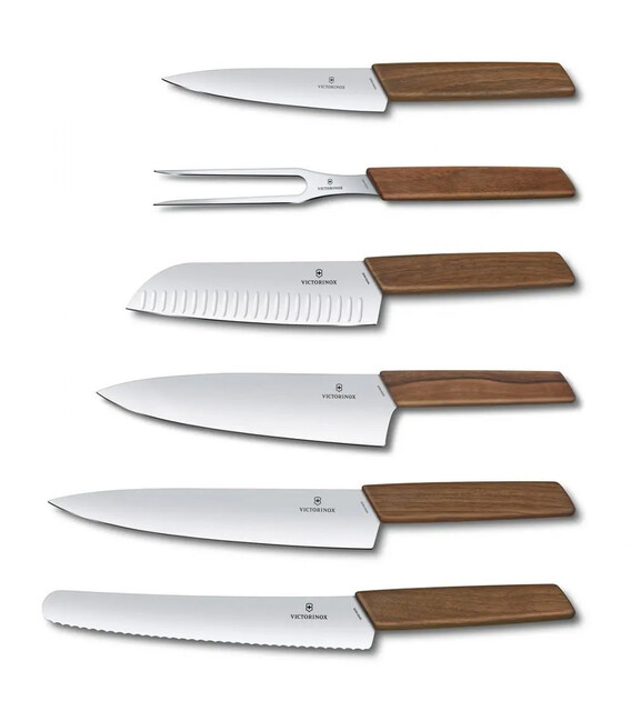 Набор кухонный Swiss Modern Cutlery Block Victorinox 6.7186.6 - потрясающий кухонный набор ножей с удобной и компактной подставкой. Вмещает в себя шесть разноплановых инструментов:- Универсальный кухонный нож, длина лезвия 15 см.- Нож Santoku, рифленый край, 17 см.- Нож для разделки с очень широким лезвием, 20 см.- Разделочный нож, 22 см.- Разделочная вилка, длина зубьев 15 см.- Нож для хлеба и кондитерских изделий, 22 см.Материал лезвий - нержавеющая сталь. Рукояти выполнены из дерева, цвет - коричневый.