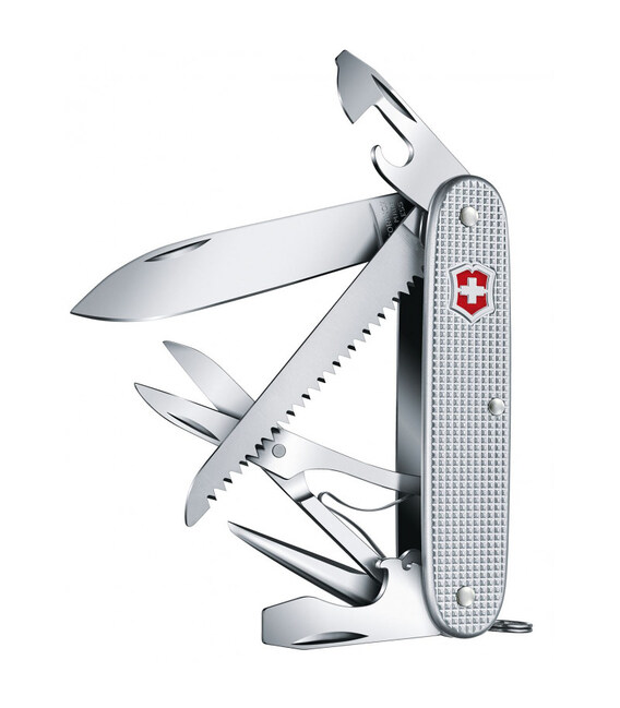Средний швейцарский складной нож Farmer X Alox 93мм / 10 функций / рифленые серебристые накладки из анодированного алюминия / ножницы / пила Victorinox 0.8271.26 Швейцария Гарантия: Пожизненная
