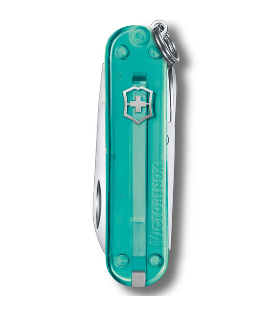 Маленький карманный нож-брелок CLASSIC SD Colors Tropical Surf 58мм / 2 слоя / 7 функций / голубые полупрозрачные накладки / ножницы Victorinox 0.6223.T24G
